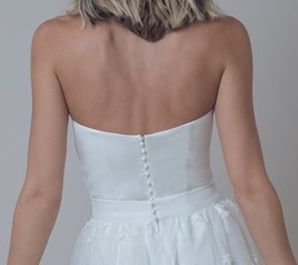 Está hecho de satén de seda cerrado por la espalda con unos botones pequeños de perlas que nos recuerda las pequeñas espinas que tienen estos frutos. Ha servido de inspiración para este corsé de novia que se puede combinar con diferentes tipos de falda.