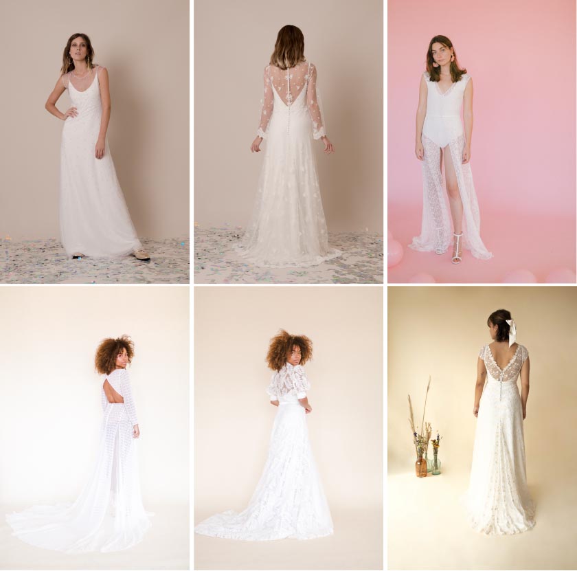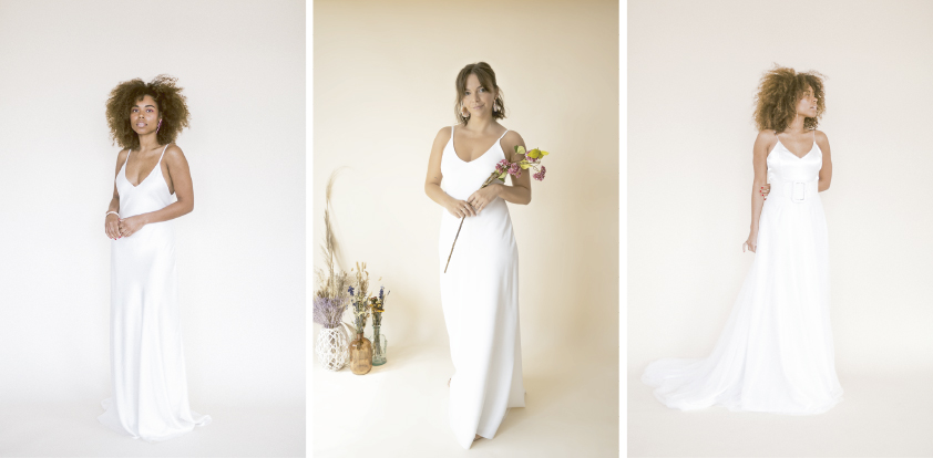 - Vestido AINA: Vestido de novia estilizado inspiración lencero, cortado al bies y confeccionado en crepe con detalle de tirante fino y espalda abierta. Es muy similar al vestido dulce pero tiene una pinza de pecho, perfecta para aquellas que tienen mucho pecho.