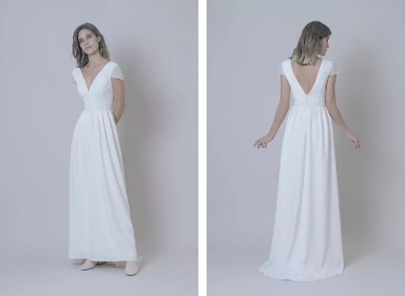 Empezamos por el vestido Lucia (de la colección MEXICO). Es un Vestido de novia de crepe que se compone de una pequeña manga y una falda cerrada con botones por delante y por detrás. Esta Inspirado en el vestido de novia de los años 70 de la madre del novio de la diseñadora.