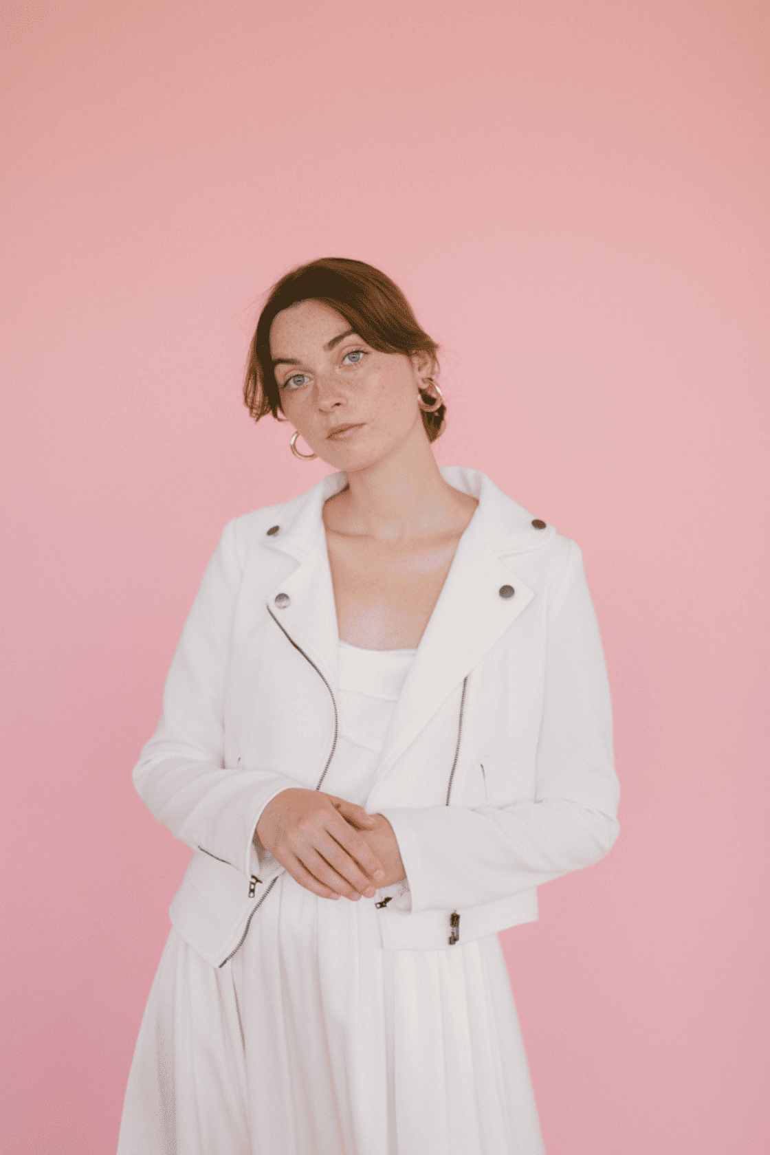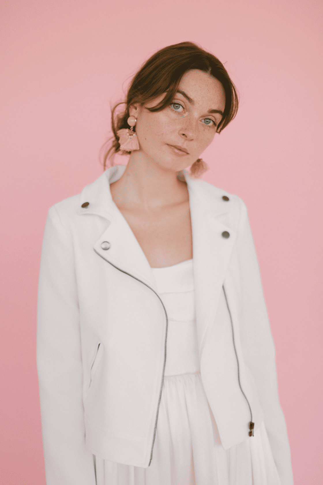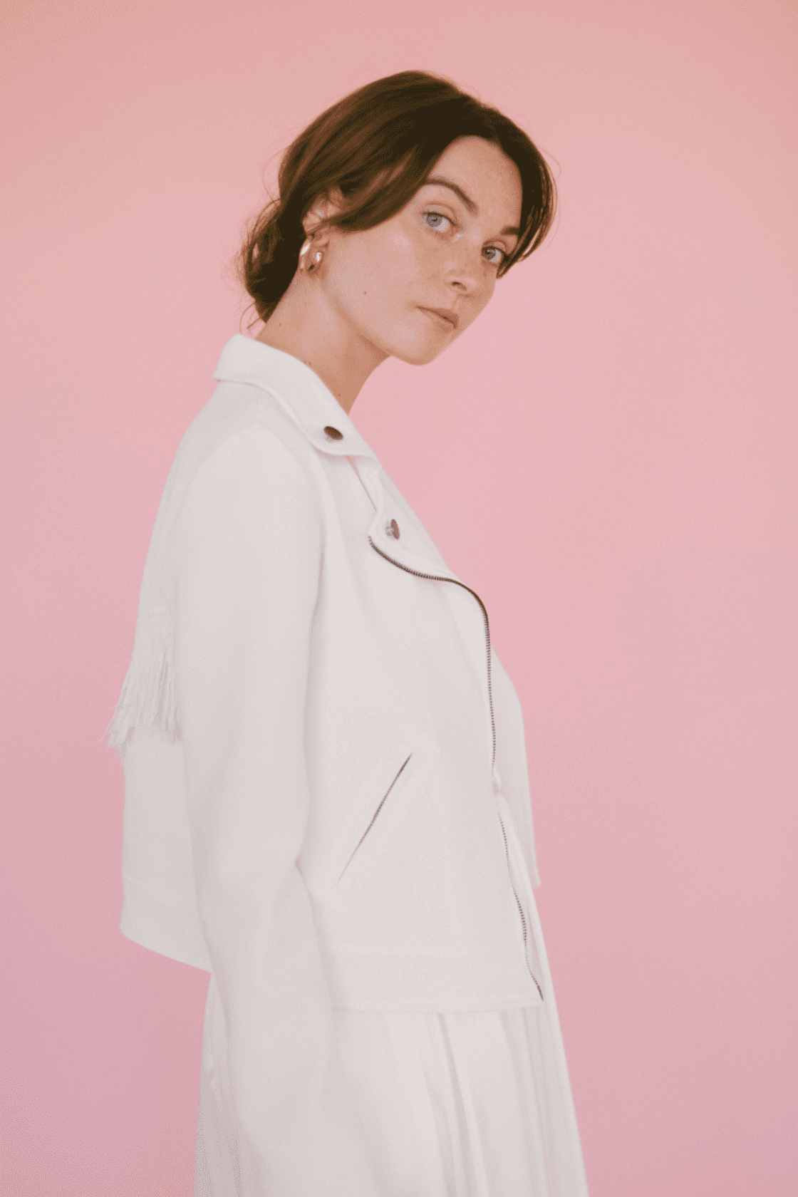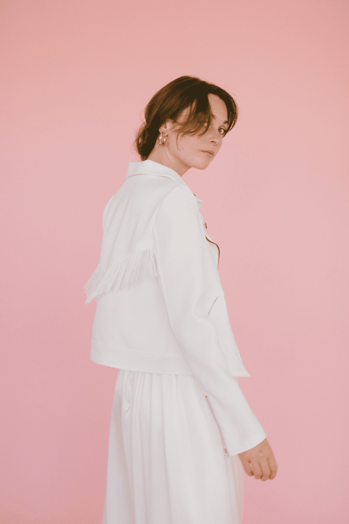 Chaqueta de novia de crepe. Solapa muesca con de botones metálicos. Se cierra con cremallera metálica por delante, en puños y bolsillos. Detalle de flecos en espalda