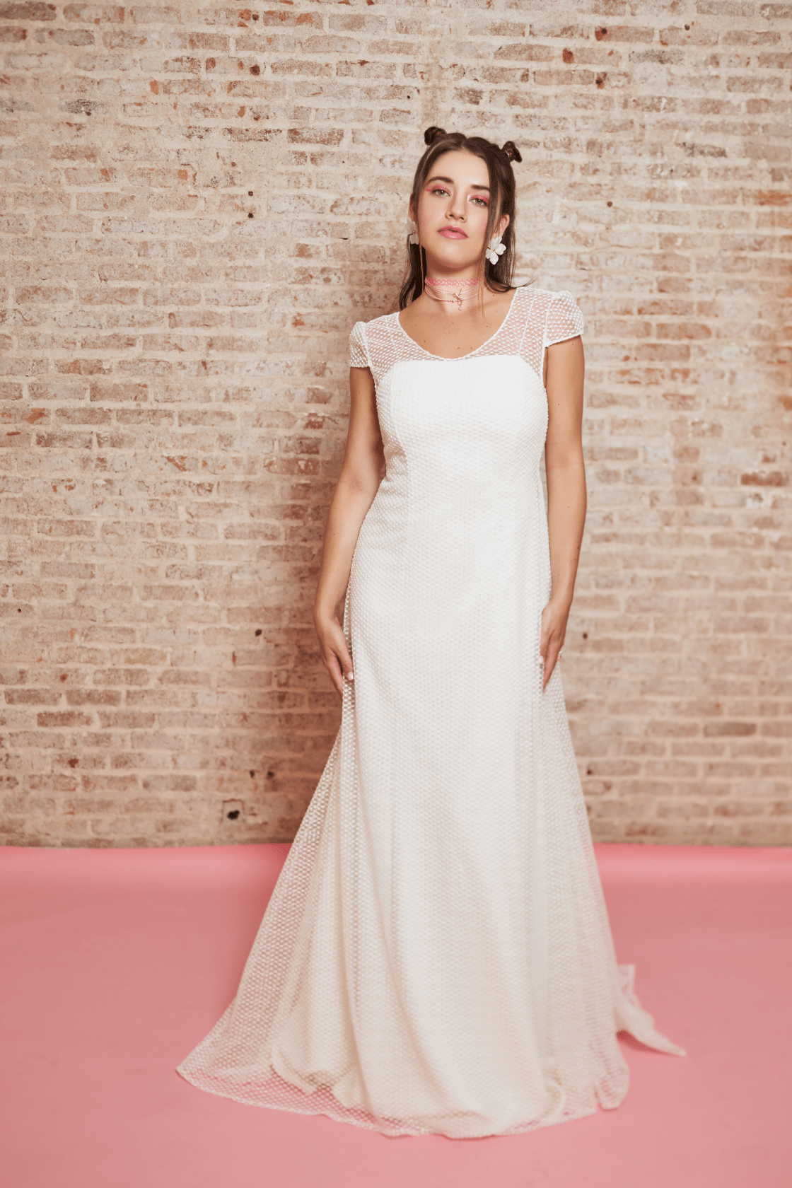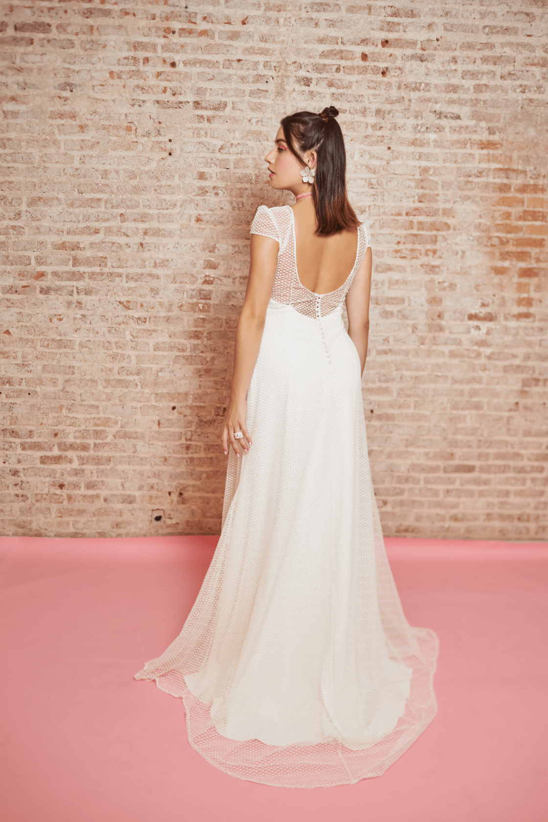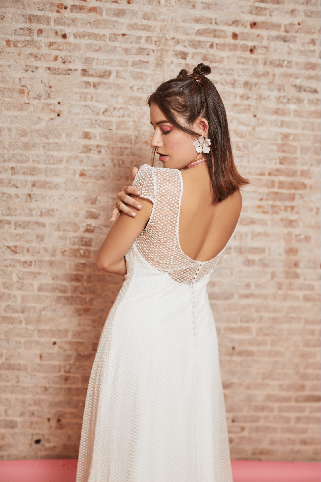 Sobrevestido de novia confeccionado en tul bordado de algodón, manga corta y escote redondo. Se cierra por la parte de la espalda con botones forrados.