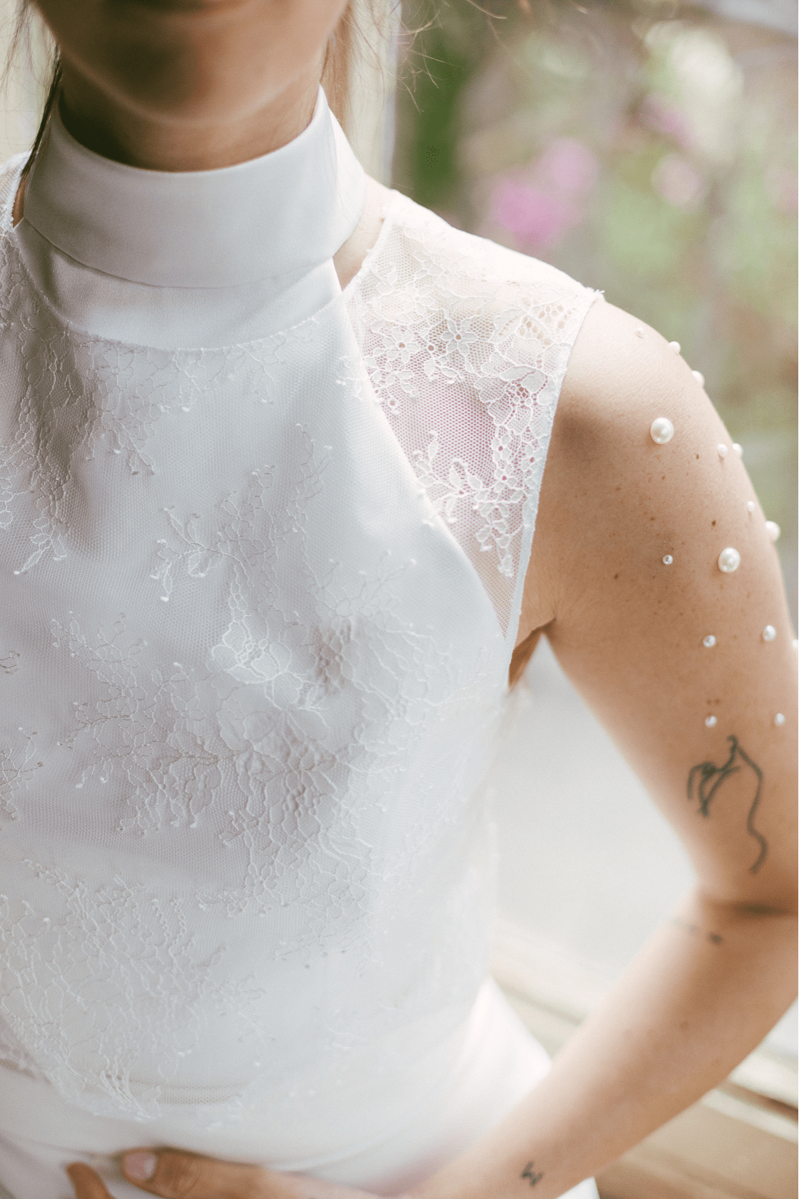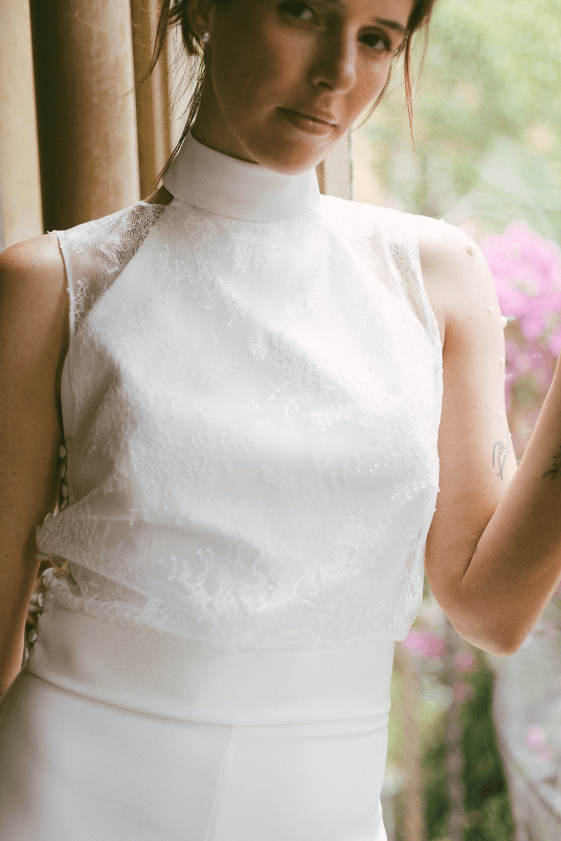 Se puede complementar con el Top Lavanda, un Crop top de novia transparente confeccionado en chantilly.