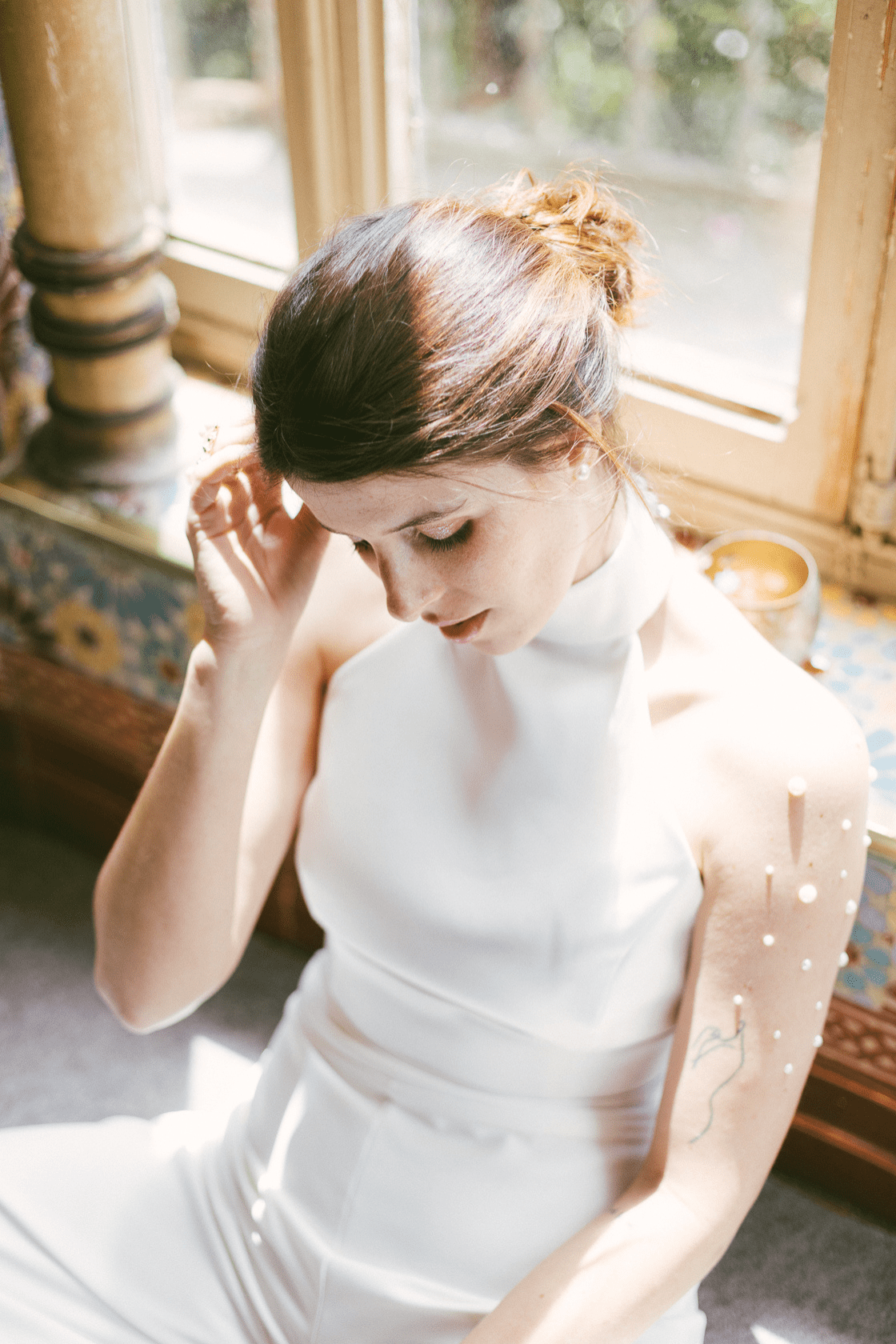 El top Clavel es un Crop top de novia con cuello halter, confeccionado en satén con efecto sedoso. Se cierra por la espalda con botoncitos forrados.