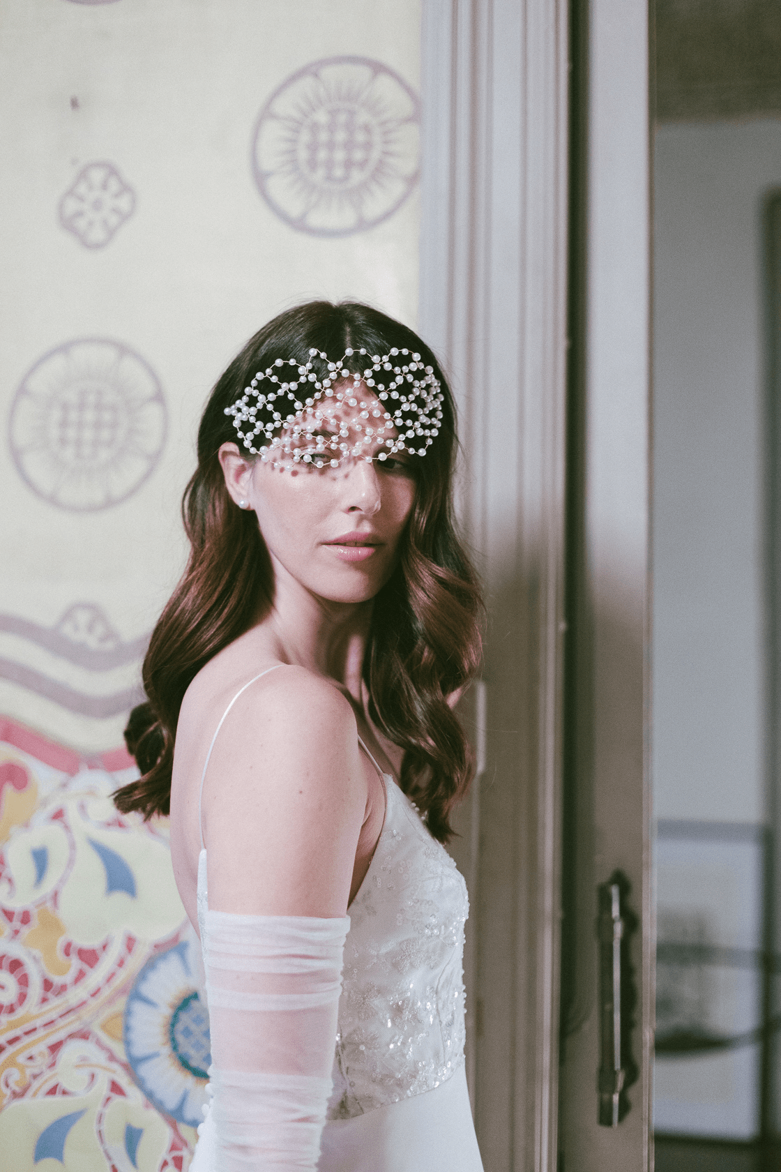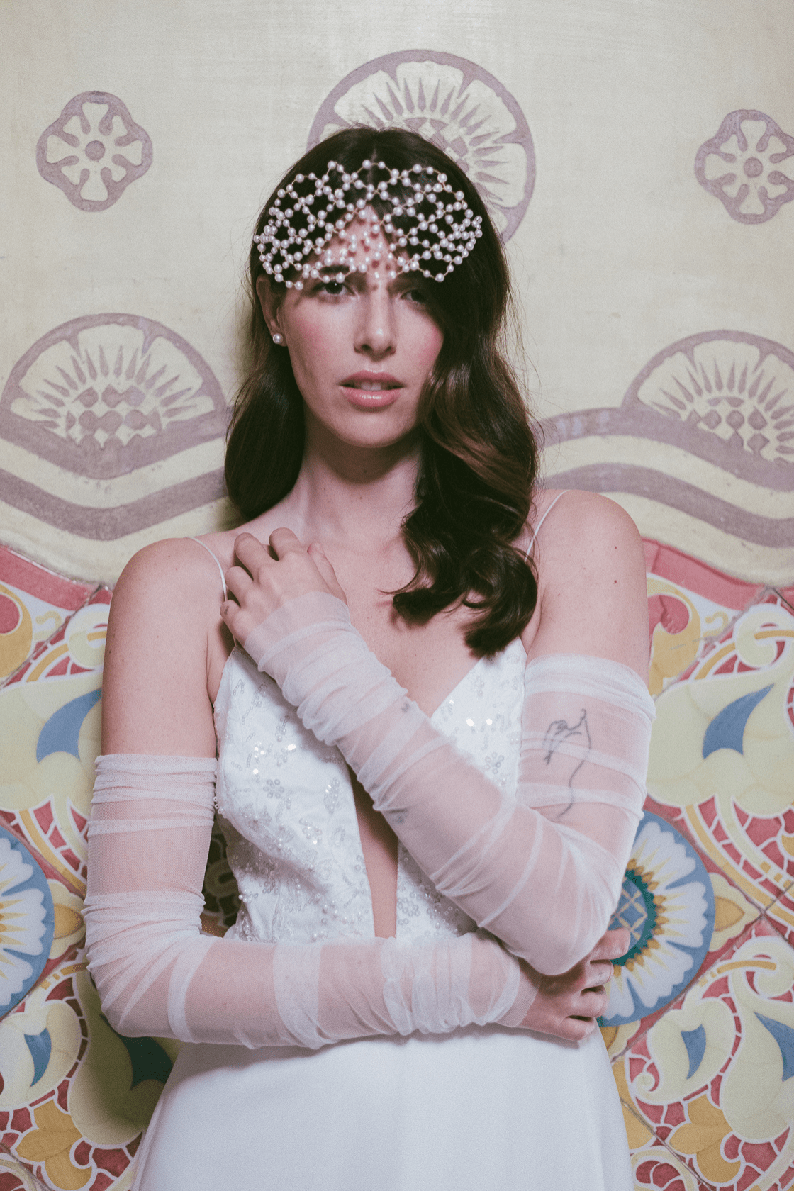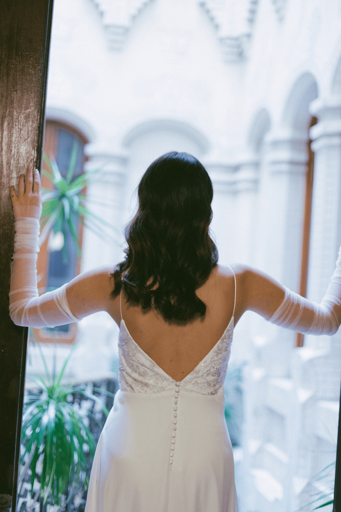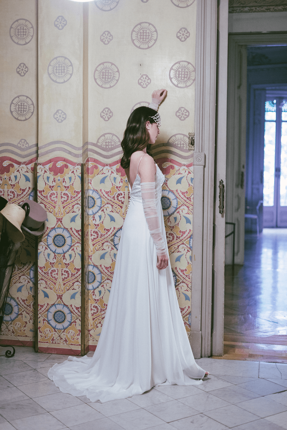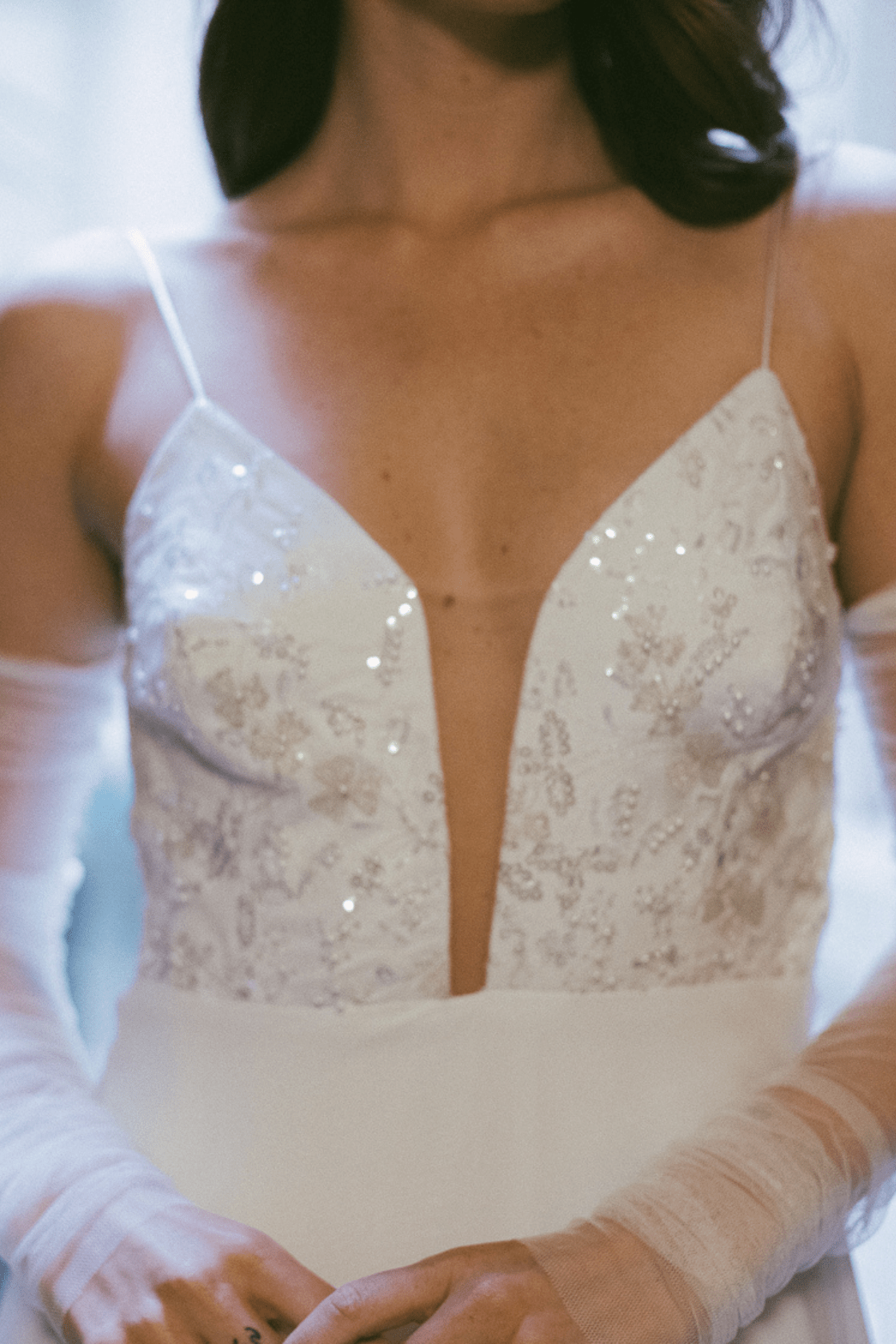 Vestido de novia de escote abierto, confeccionado en pedrería fina con tirante efecto espagueti. La falda de media capa está confeccionada en gasa sedosa. Se cierra por la espalda con botoncitos forrados.