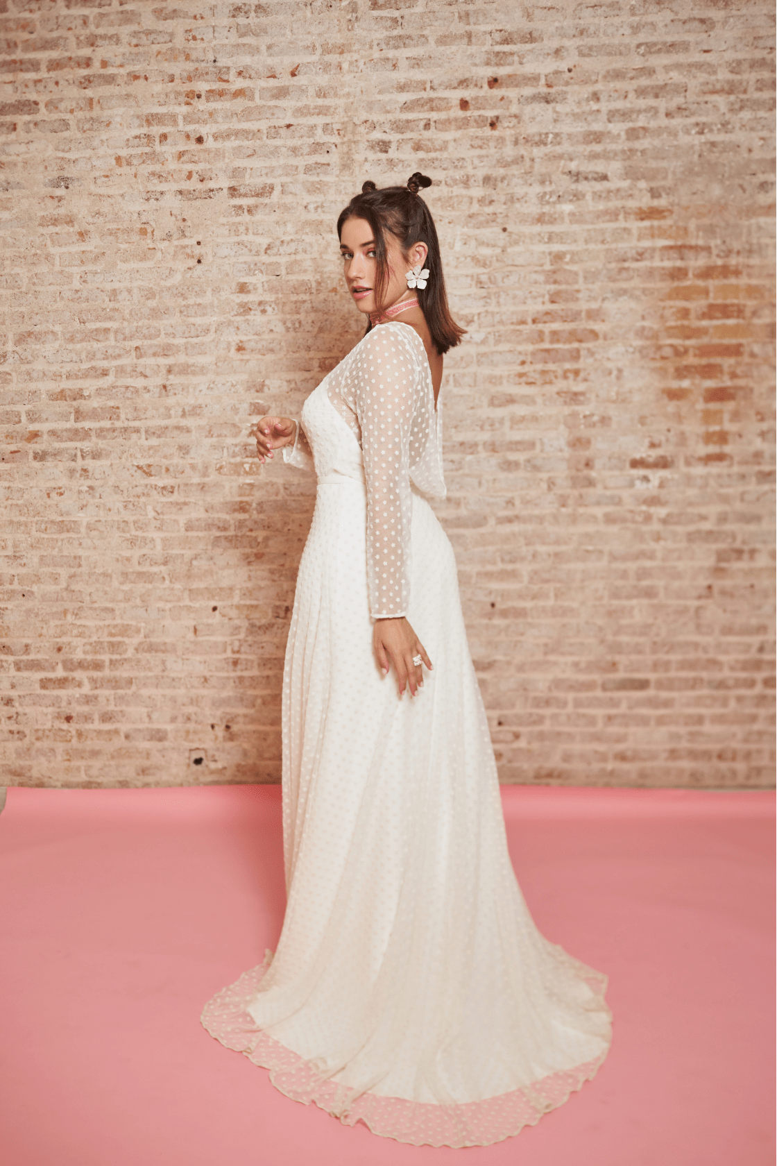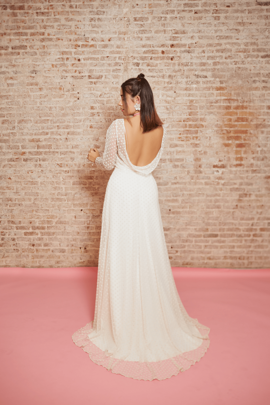 Sobrevestido de novia confeccionado con tul bordado. Manga larga ajustada, abotonado por la parte delantera y drapeado en la parte de la espalda.