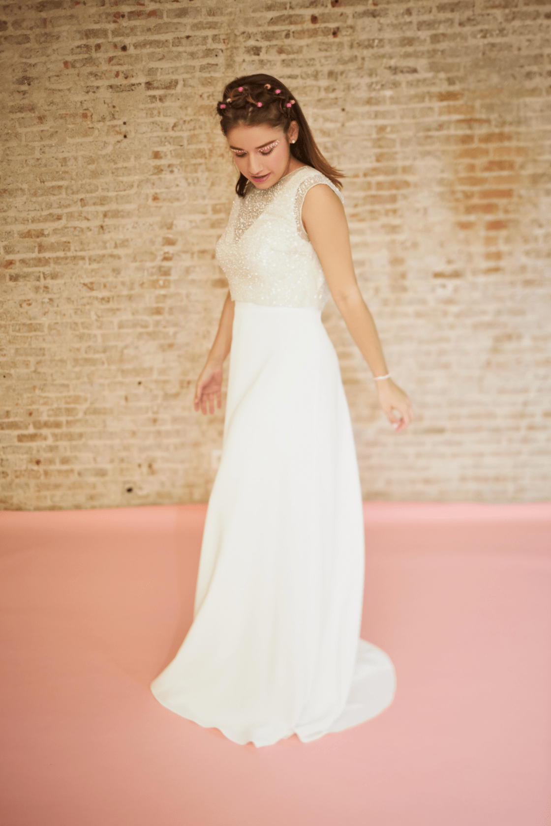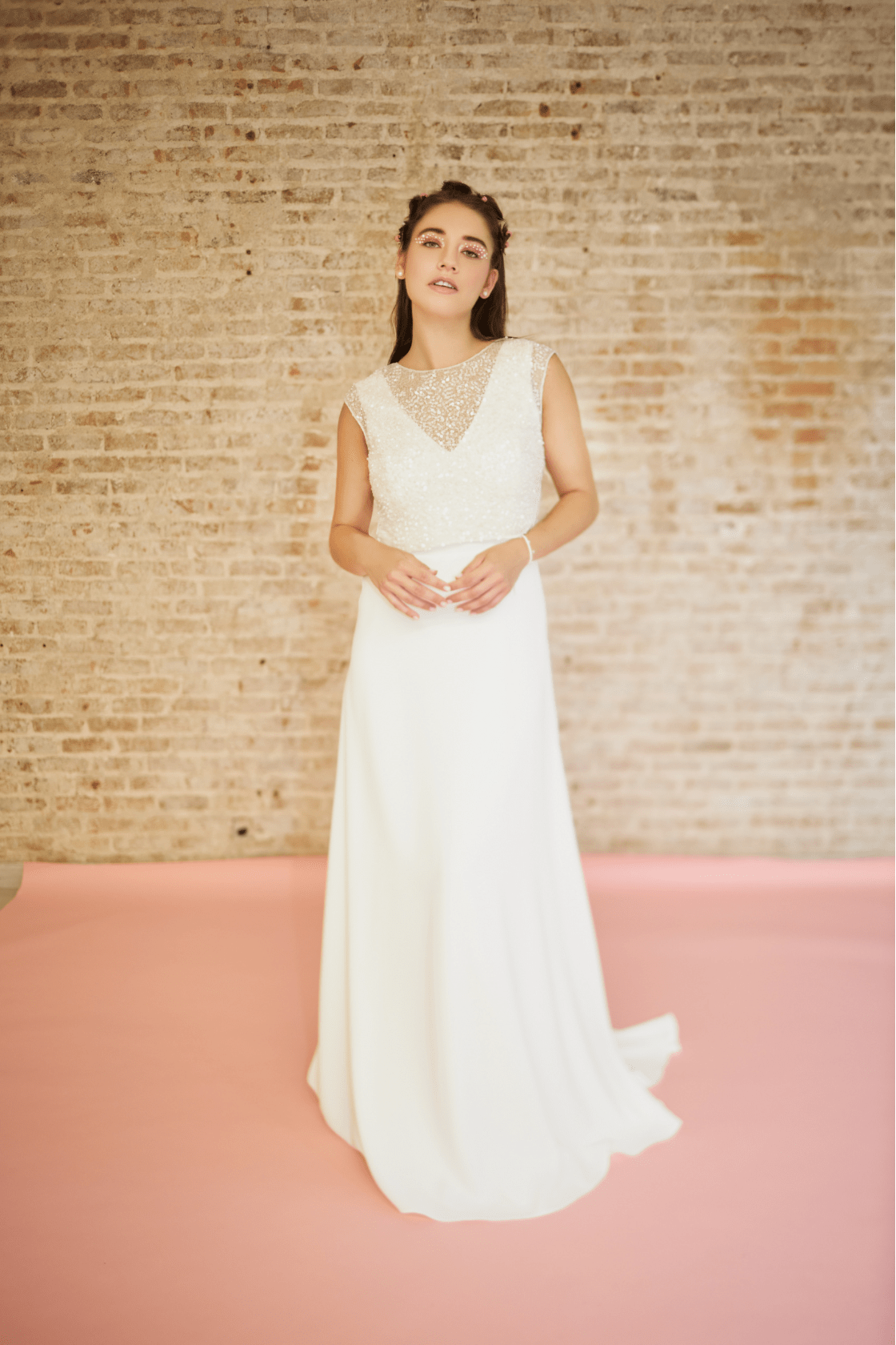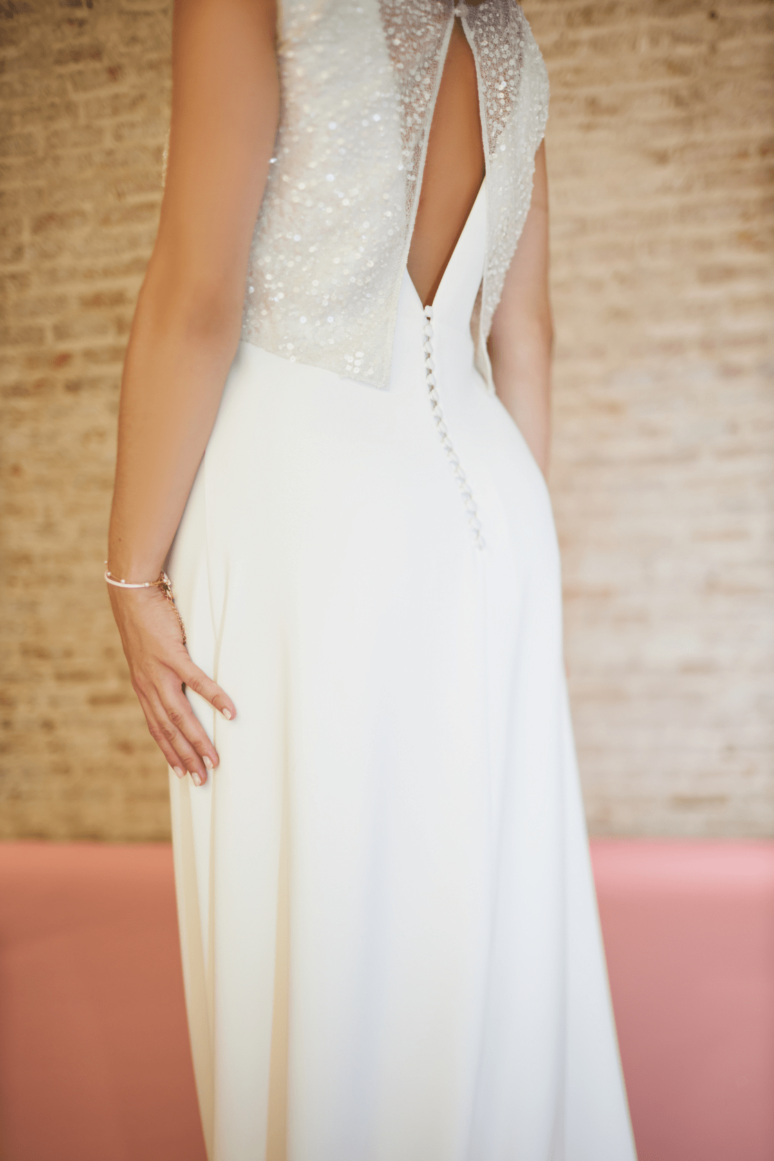 Top de novia de lentejuelas con escote redondo y espalda en forma de triángulo. Se cierra con botones forrados en la parte posterior.