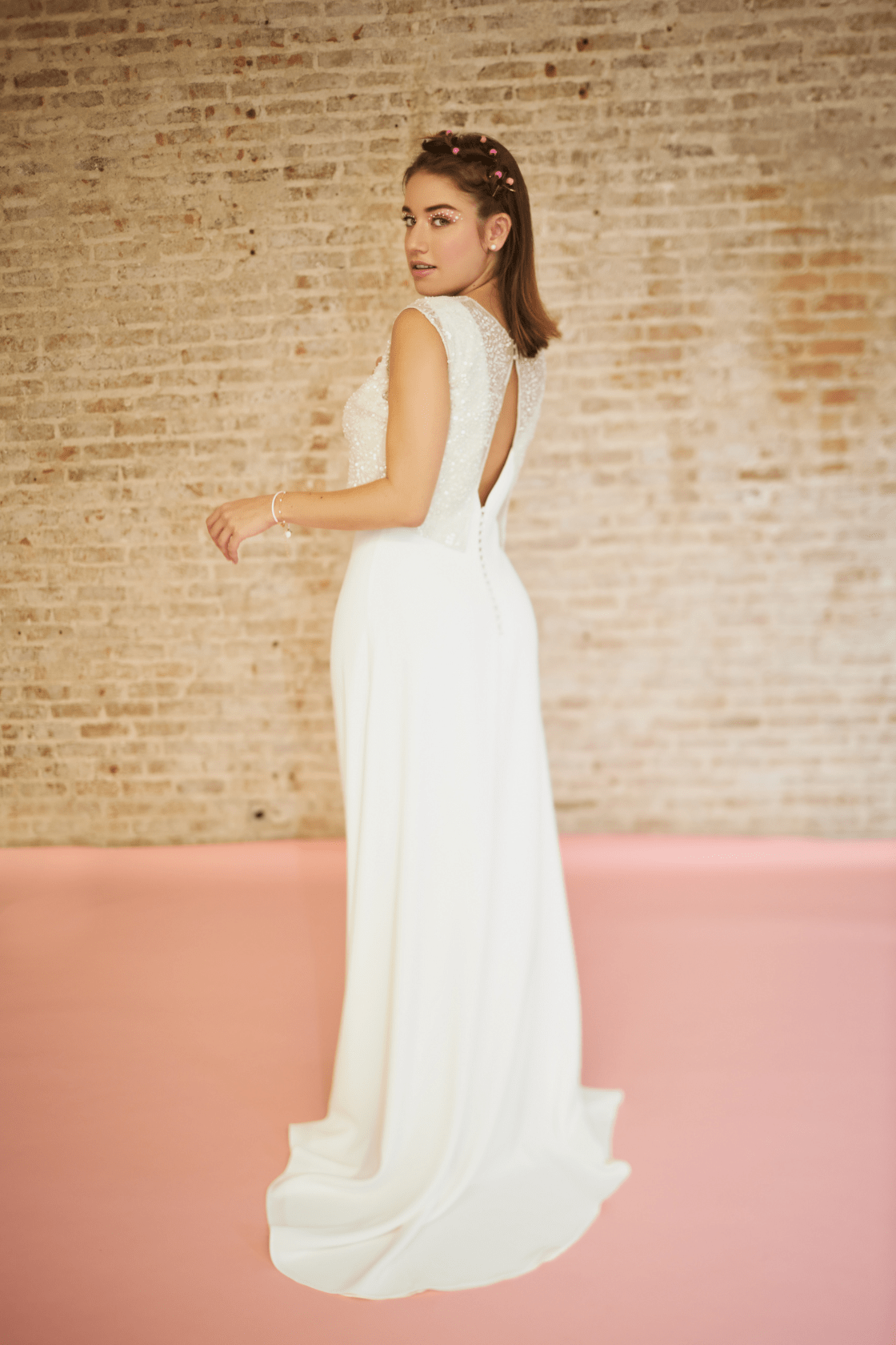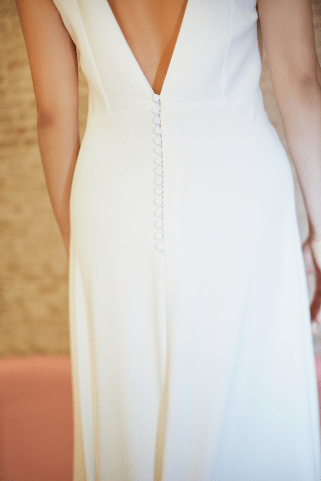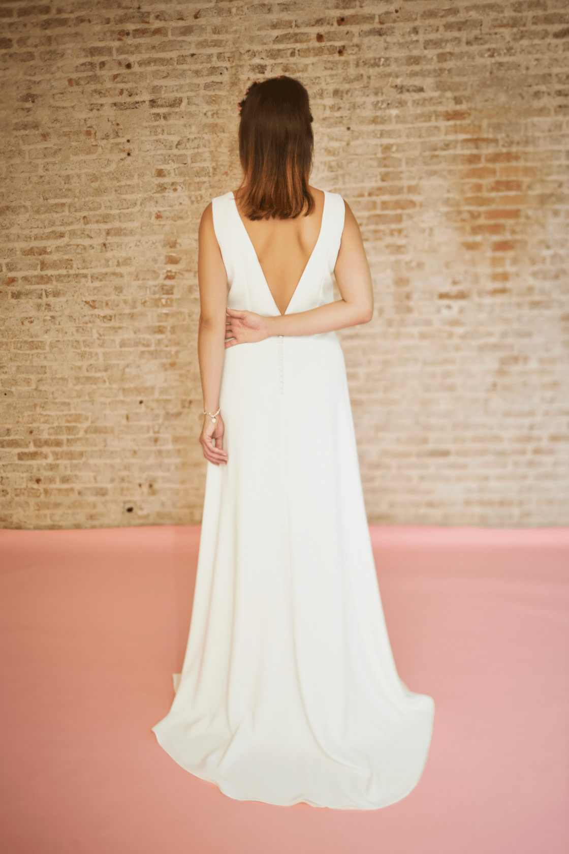Vestido de novia con escote en pico por delante y por detrás. Confeccionado en crepe y cerrado por detrás con botones forrados.
