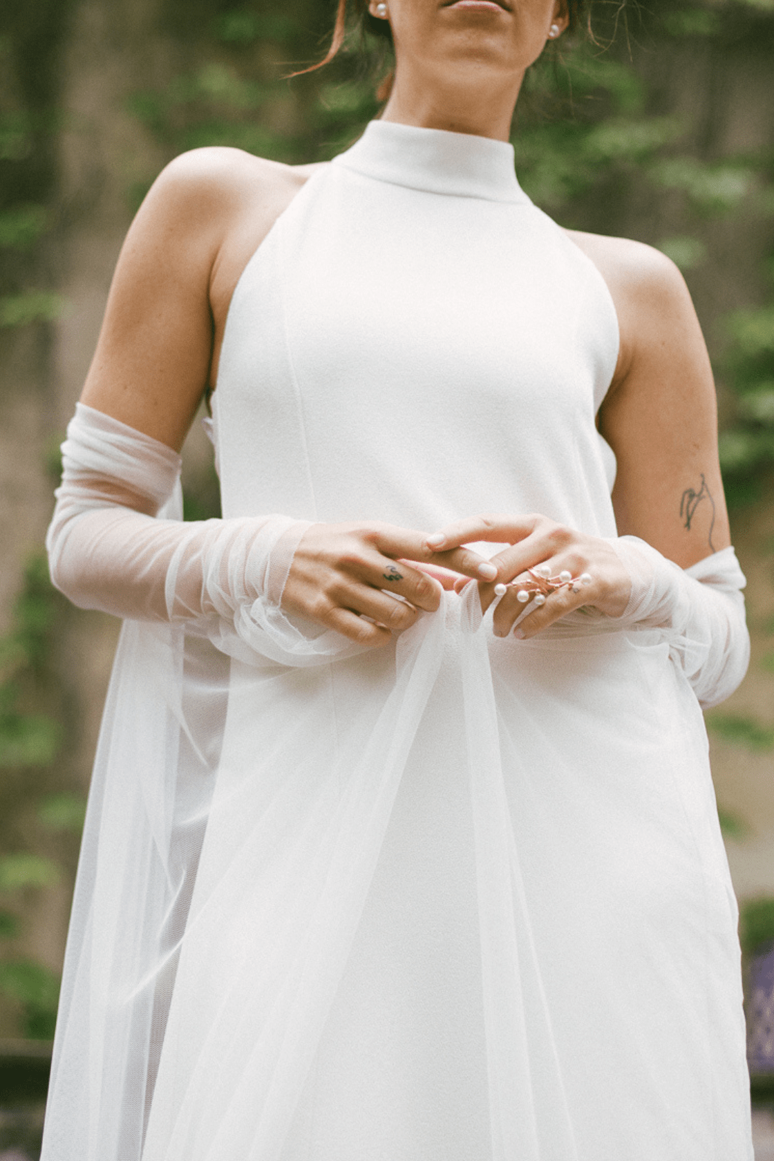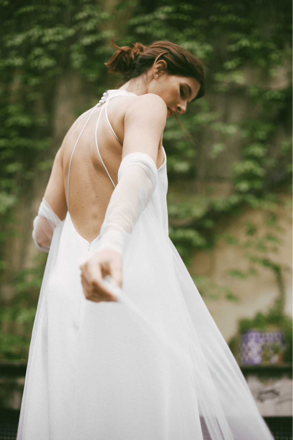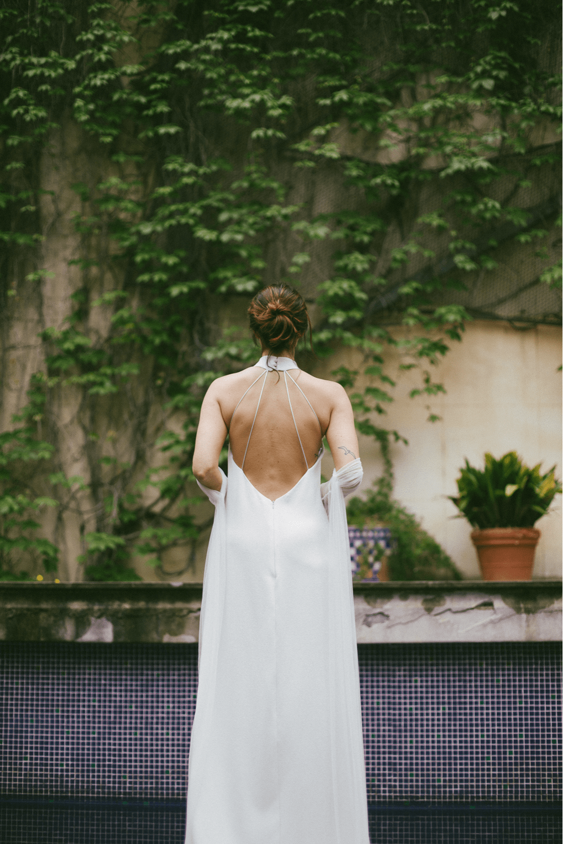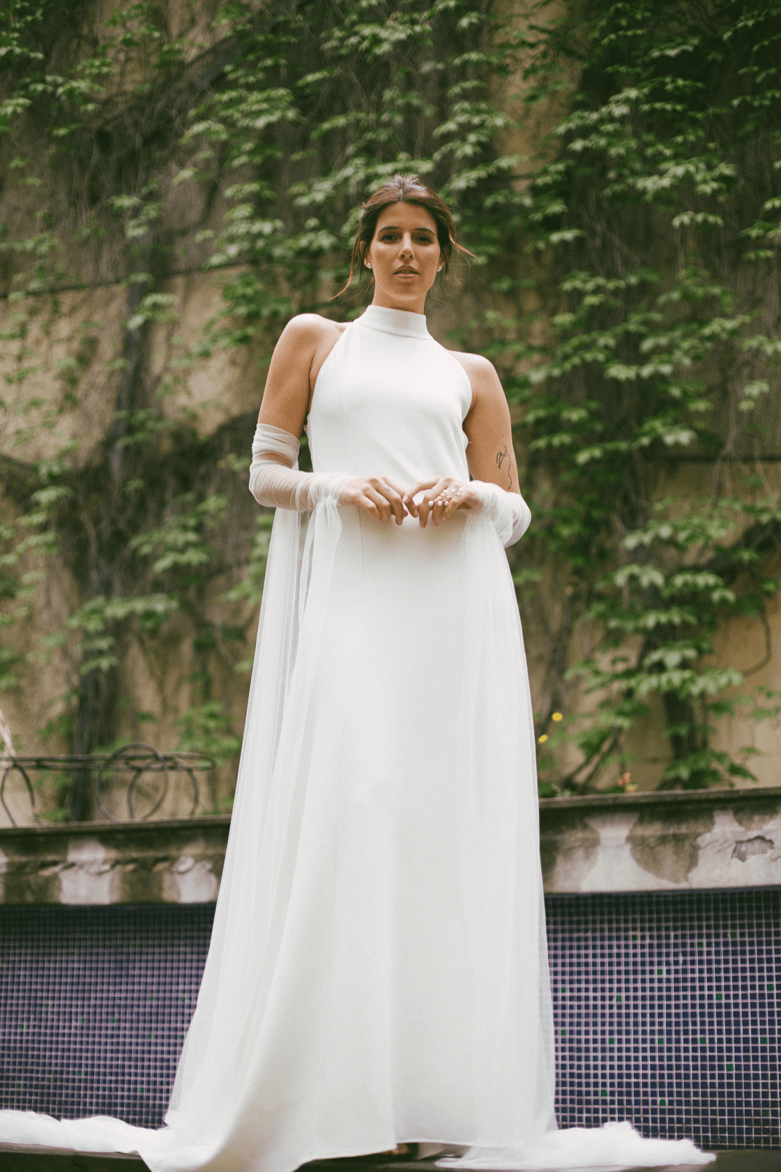 Vestido de novia con cuello halter, cerrado por la espalda con botoncitos y detalle de tirantes tipo espagueti. Confeccionado en crepe rugoso.