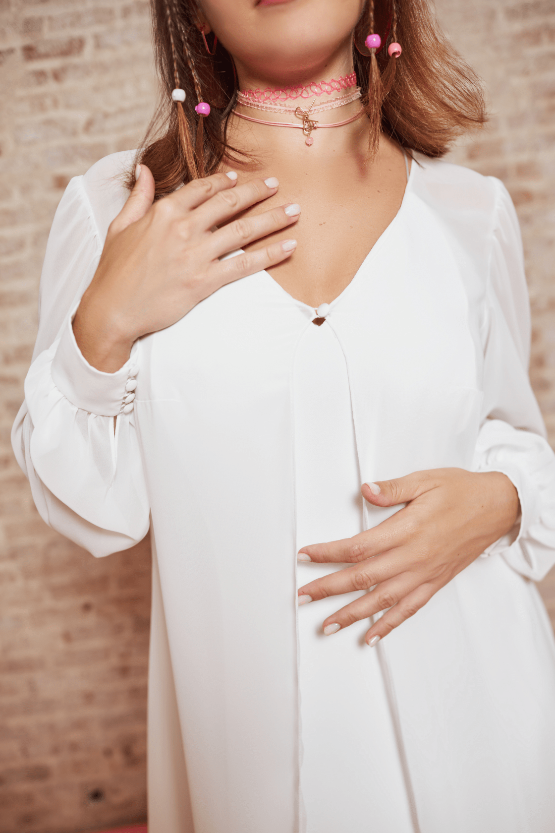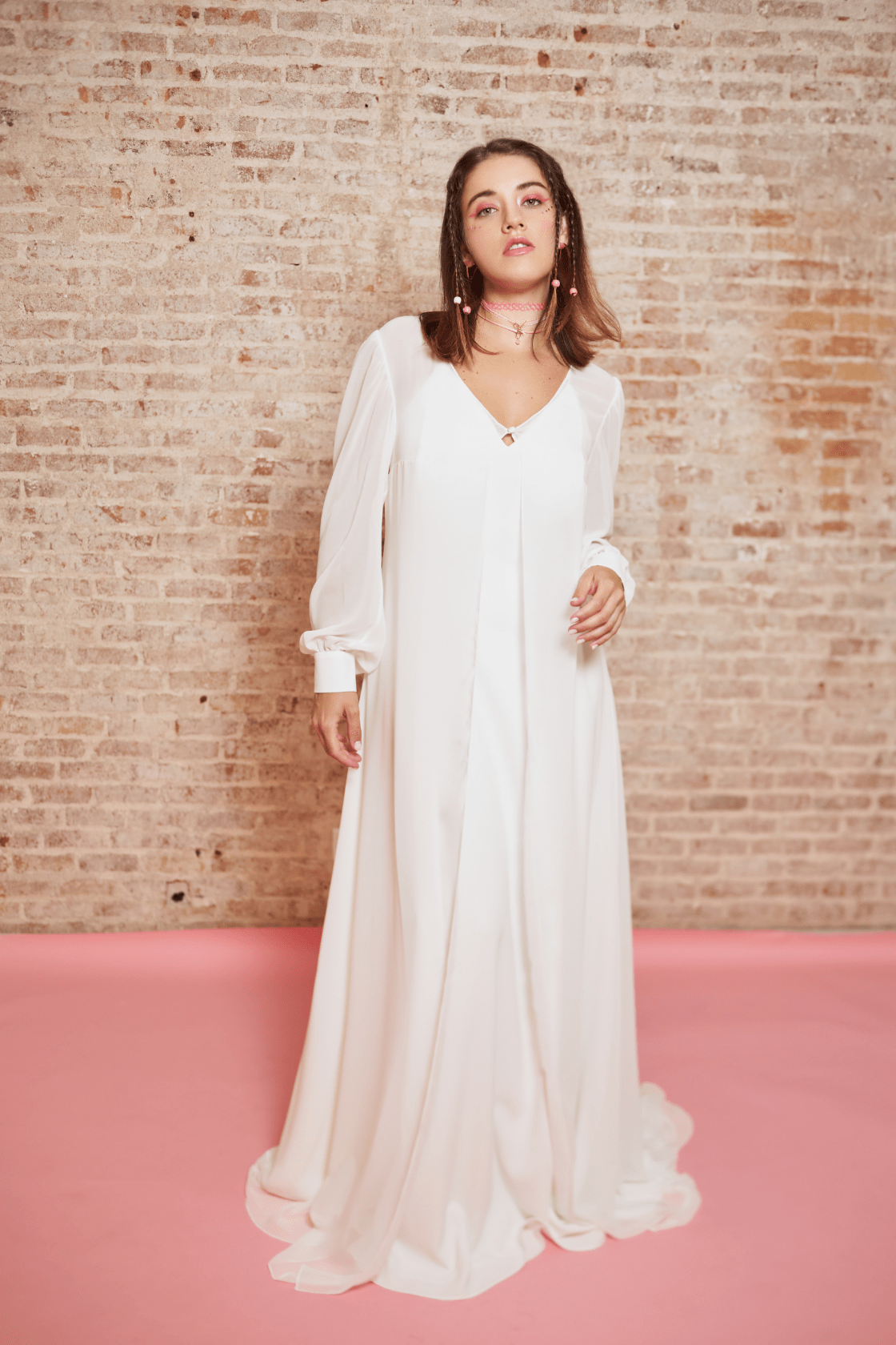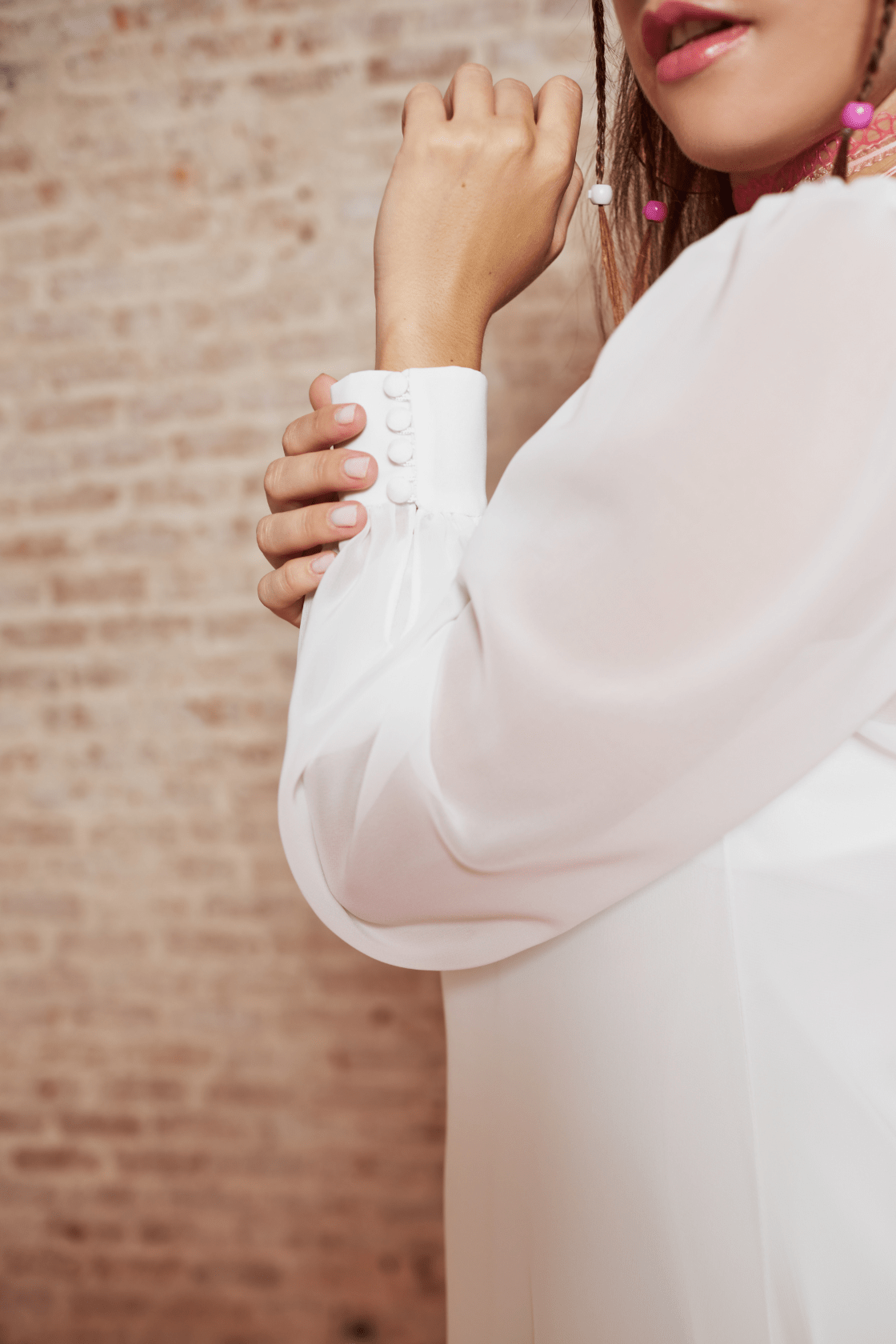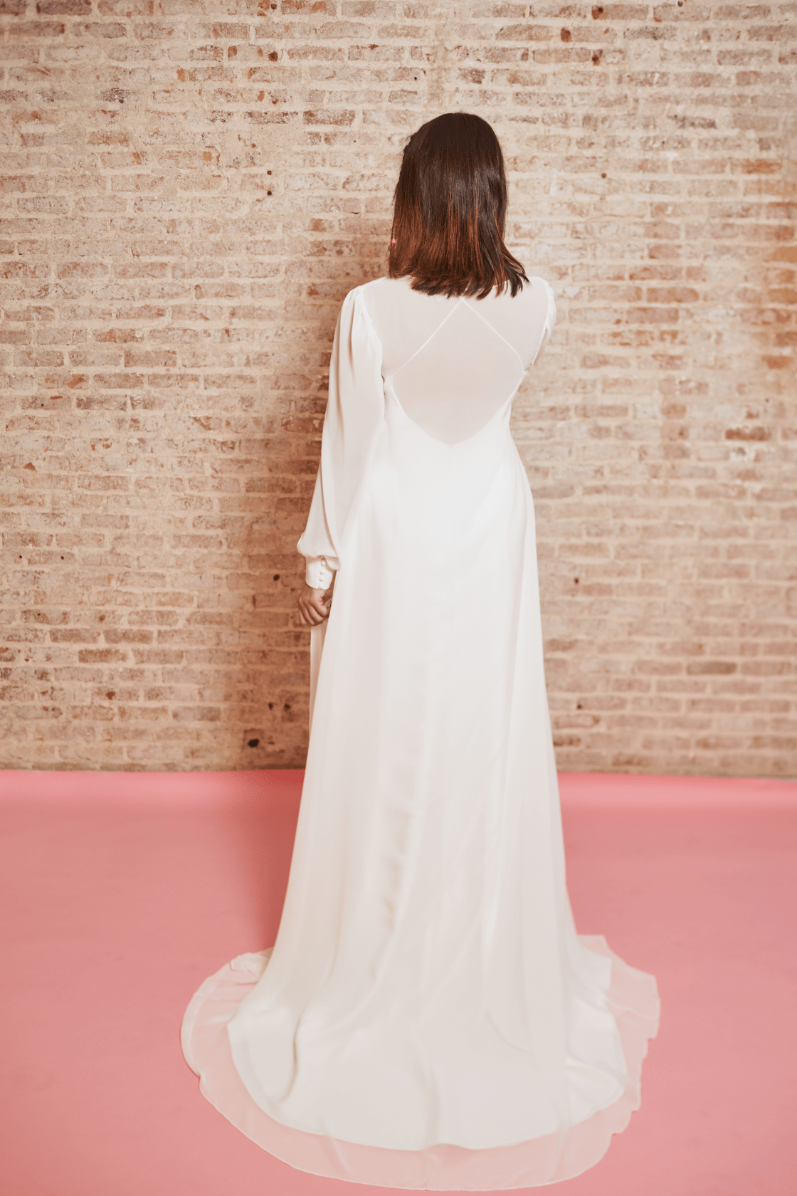 Sobrevestido de novia confeccionado en gasa sedosa totalmente transparente. Mangas fruncidas y abullonadas acabadas en un puño con botones forrados.