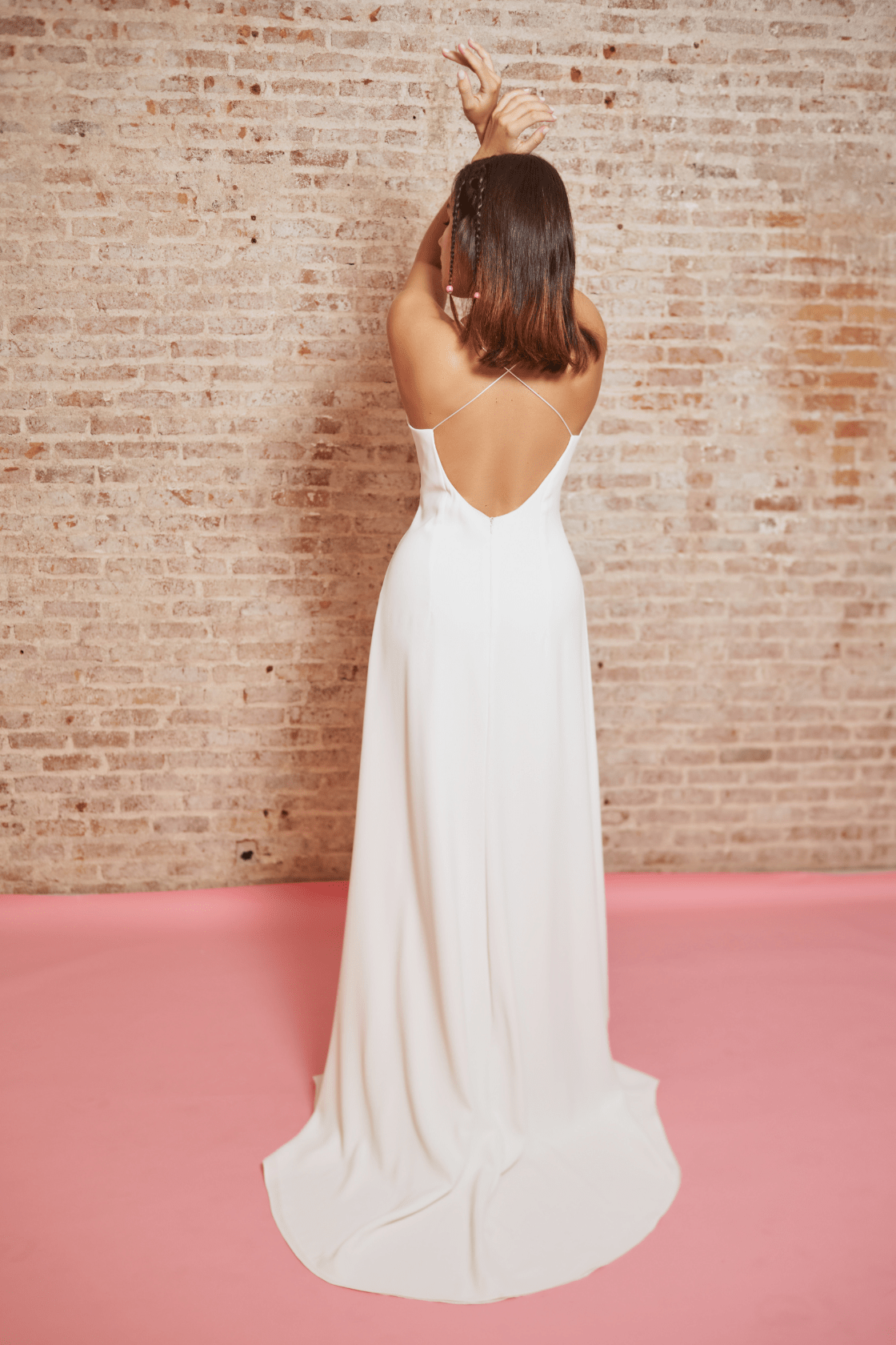 Vestido de novia confeccionado en crepe con corte en costadillo, escote en pico, detalle de tirantes cruzados en la parte de la espalda y apertura en el bajo.