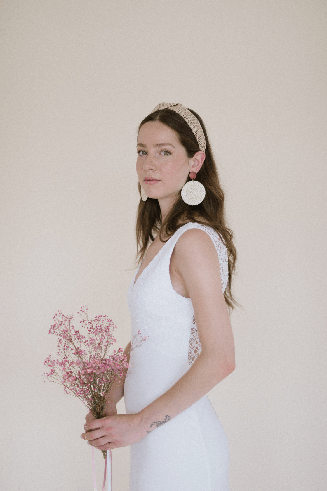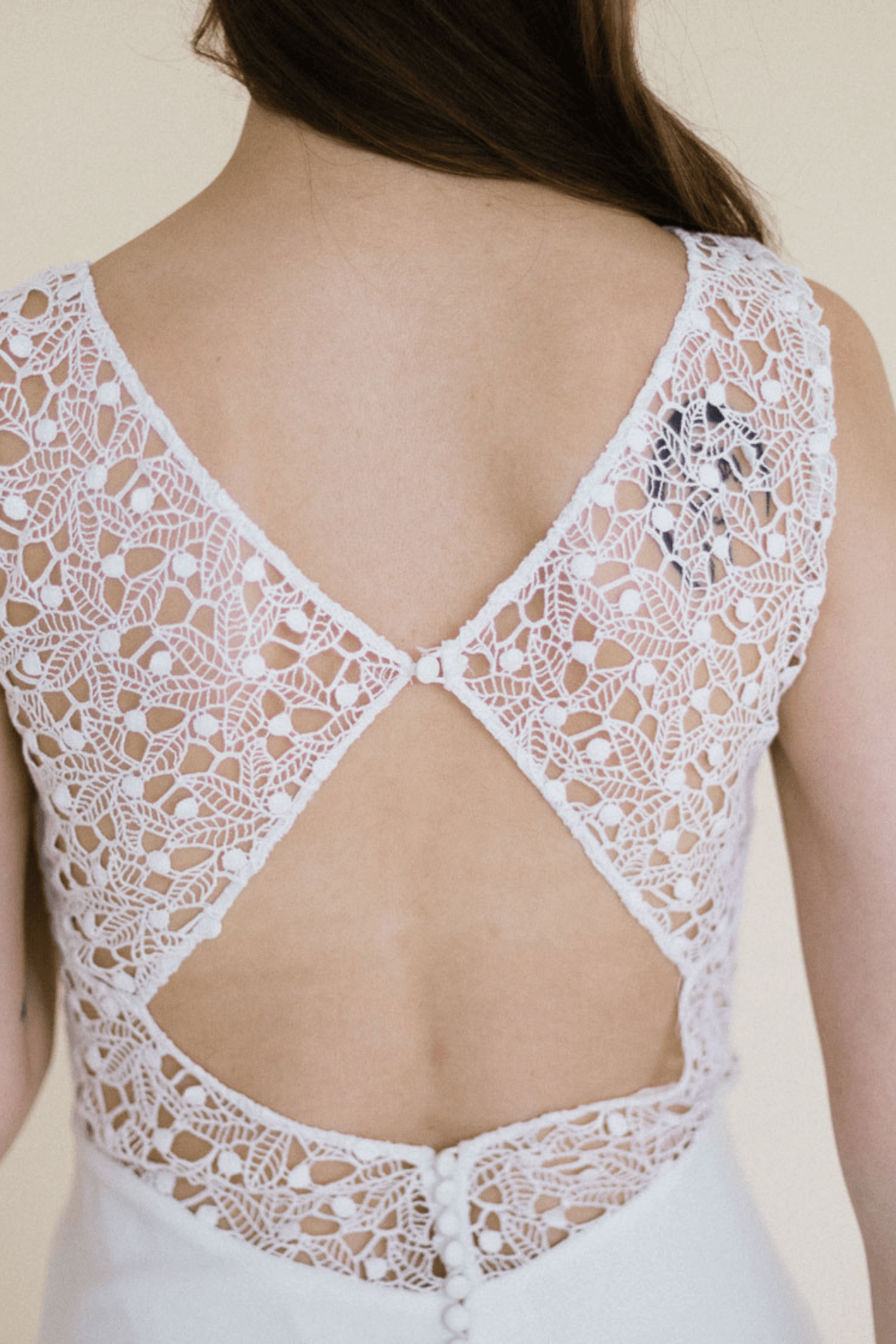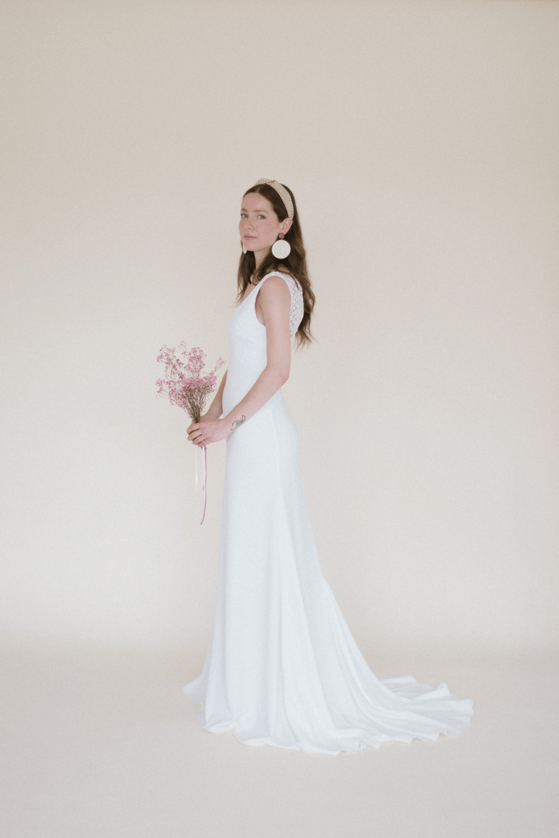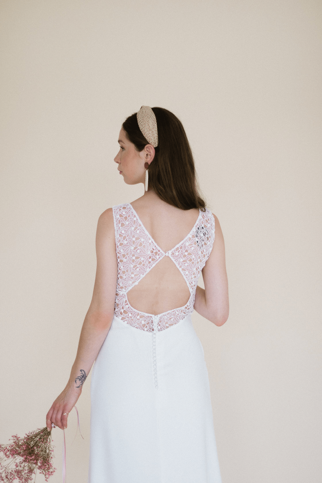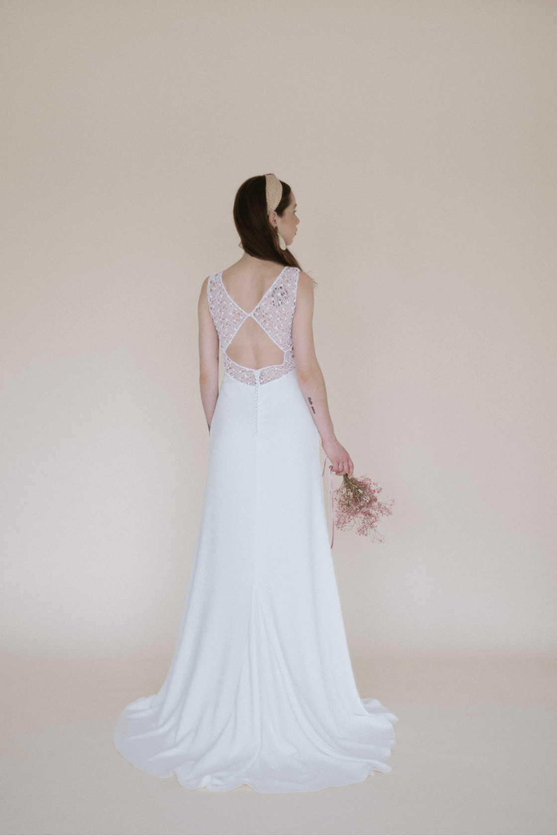 Vestido de novia cortado al bies, confeccionado en satén sedoso con detalle de gasa en el pecho. Escote en pico y espalda abierta con detalle de botoncitos forrados. Godet en la falda con efecto cauda.