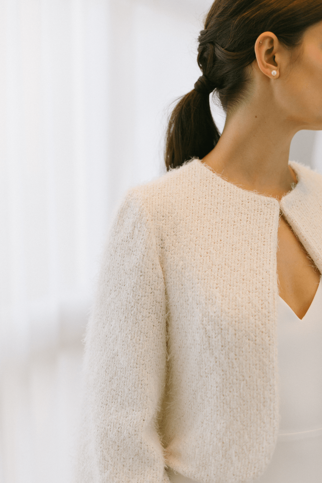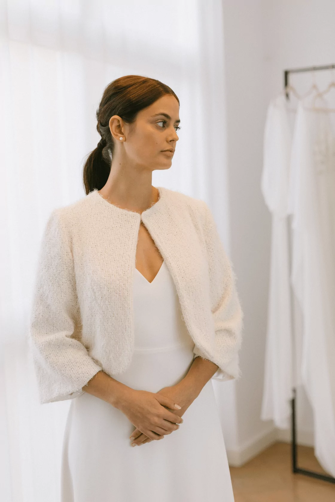 Esta chaqueta de novia es el complemento perfecto para añadir calidez y estilo a tu look nupcial. Con manga 3/4 y un tacto suave de pelito, está cuidadosamente forrada para mayor confort y comodidad durante todo el día.