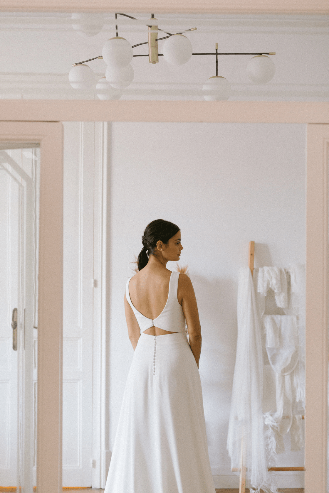 Falda de novia de gasa con botones forrados.