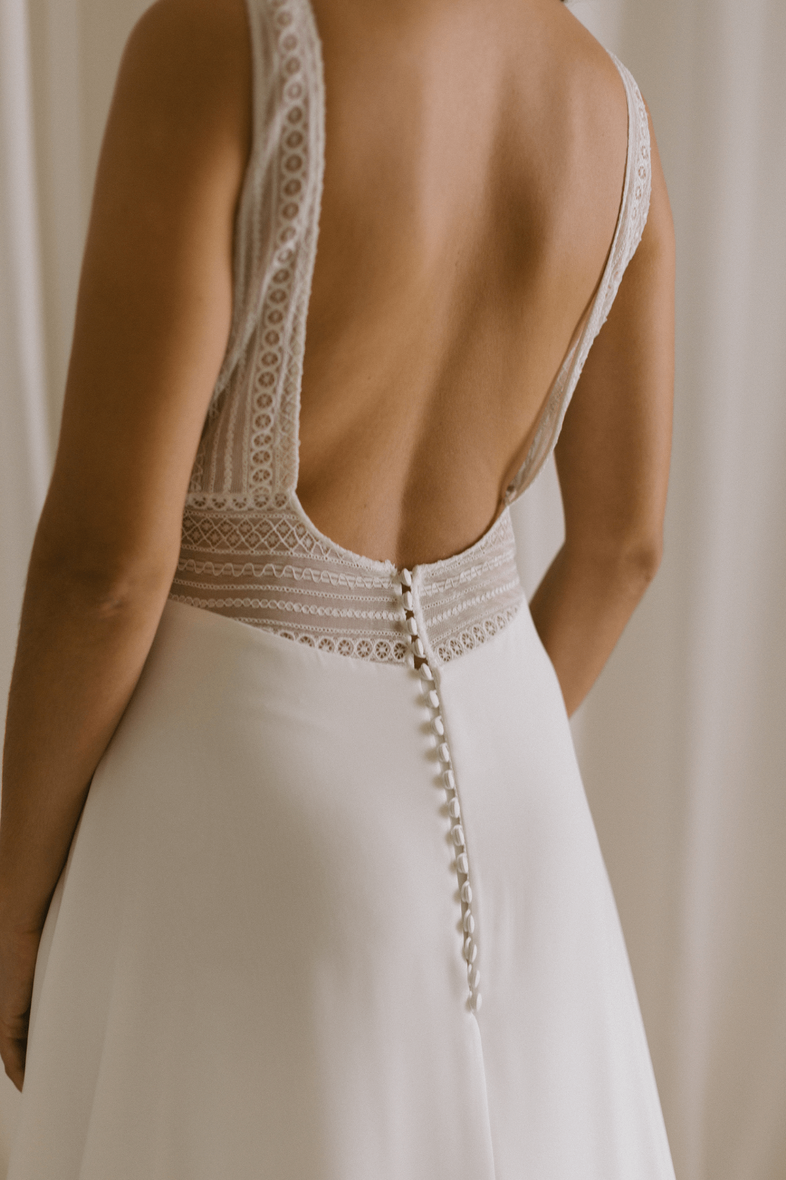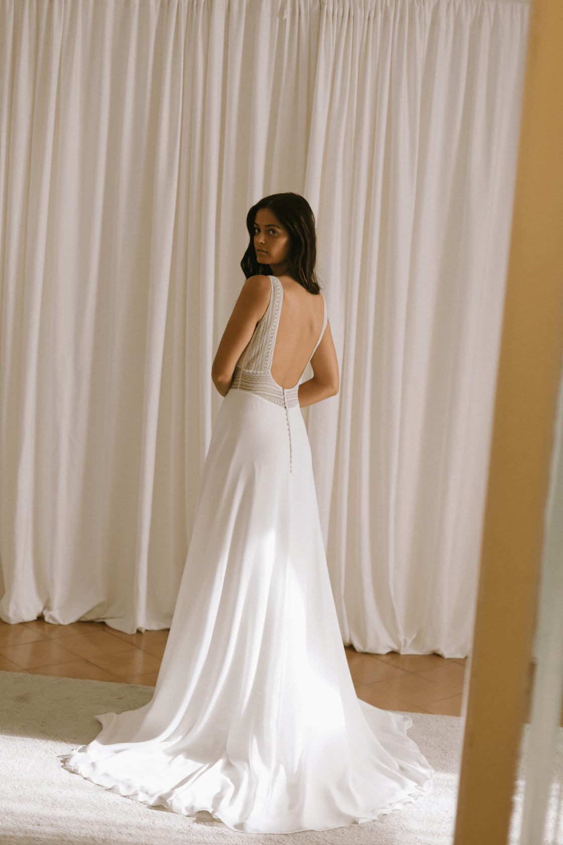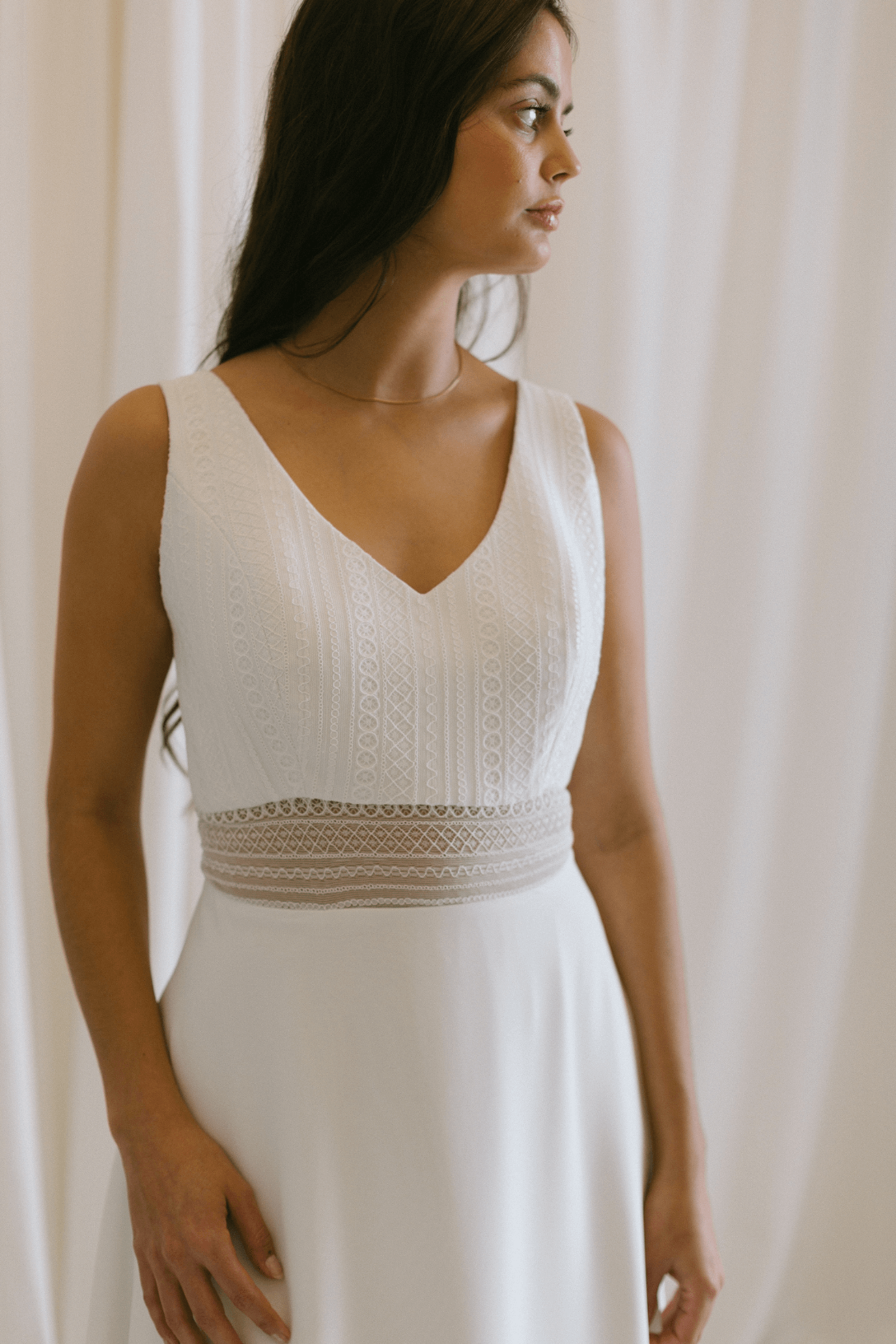 Un vestido de novia que une ligereza, arte y modernidad. Su falda de gasa con volumen envuelve cada movimiento con gracia, mientras el cuerpo de crepe forrado en tul bordado en algodón destaca por sus delicadas formas lineales que estilizan la figura.