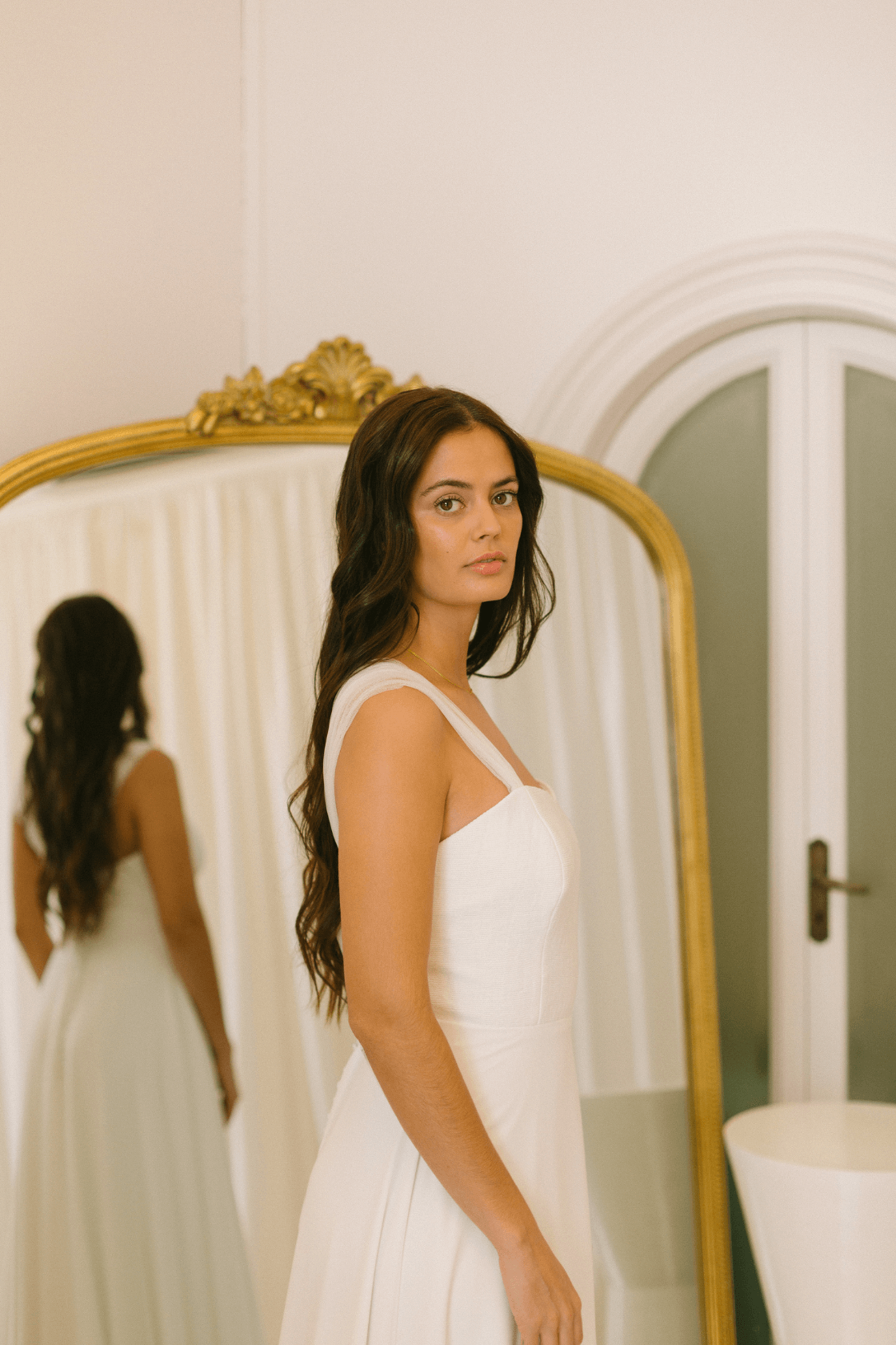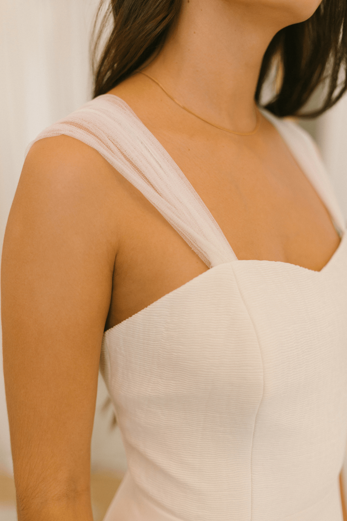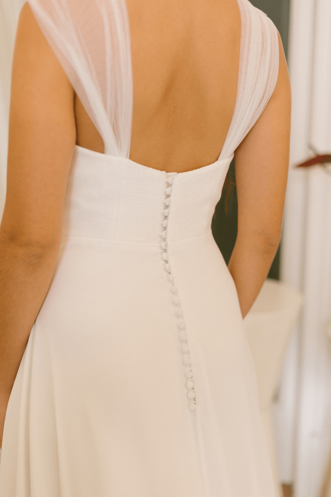 Este vestido de novia combina elegancia, movimiento y delicadeza. Su falda de gasa de media capa ofrece una caída ligera y vaporosa, ideal para una novia que busca un estilo natural y romántico. El cuerpo de crepe rugoso con textura aporta un toque moderno y sofisticado, realzado con tirantes de tul que añaden suavidad y feminidad. Los botones forrados en la espalda completan este vestido de novia con un acabado clásico y atemporal.