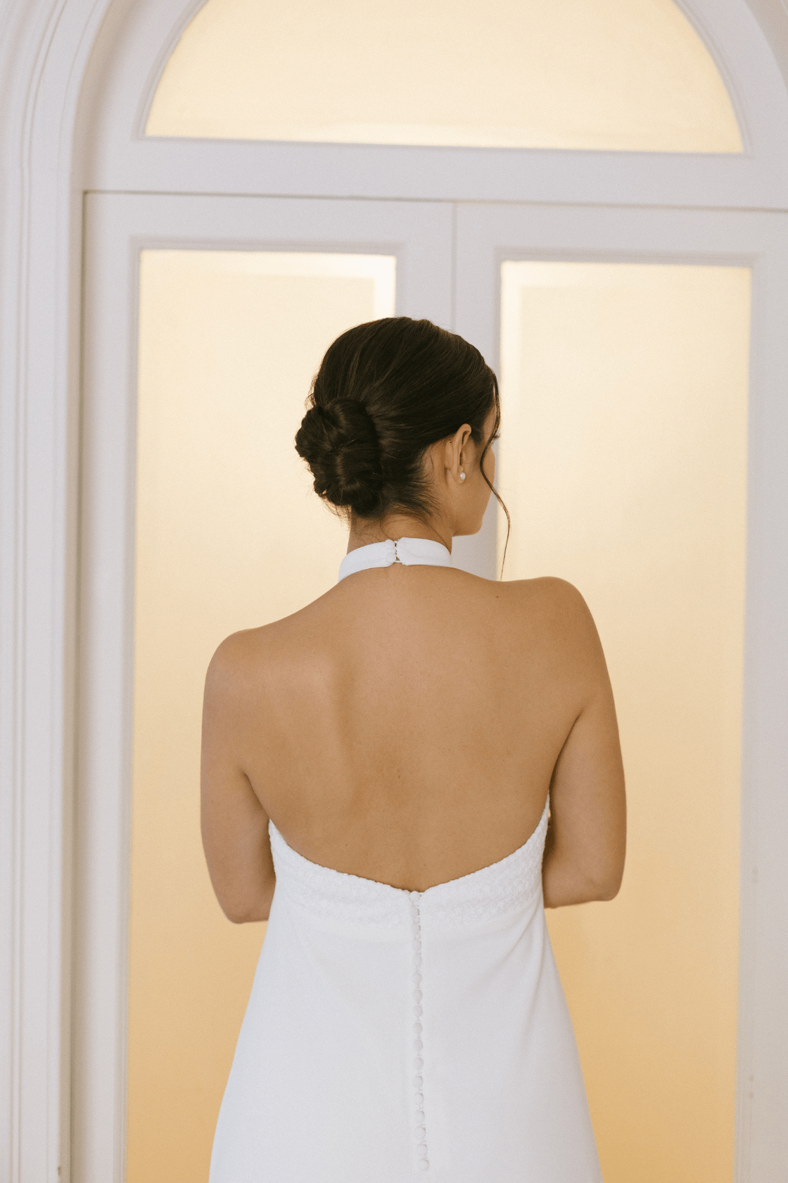 Este vestido de novia destaca por su diseño moderno y sofisticado. Con un escote halter que realza los hombros y la espalda, y una falda de crepe de media capa que aporta caída ligera y movimiento elegante. El cuerpo forrado en tul bordado en algodón añade un toque artesanal y delicado, creando texturas sutiles que hacen único el vestido.