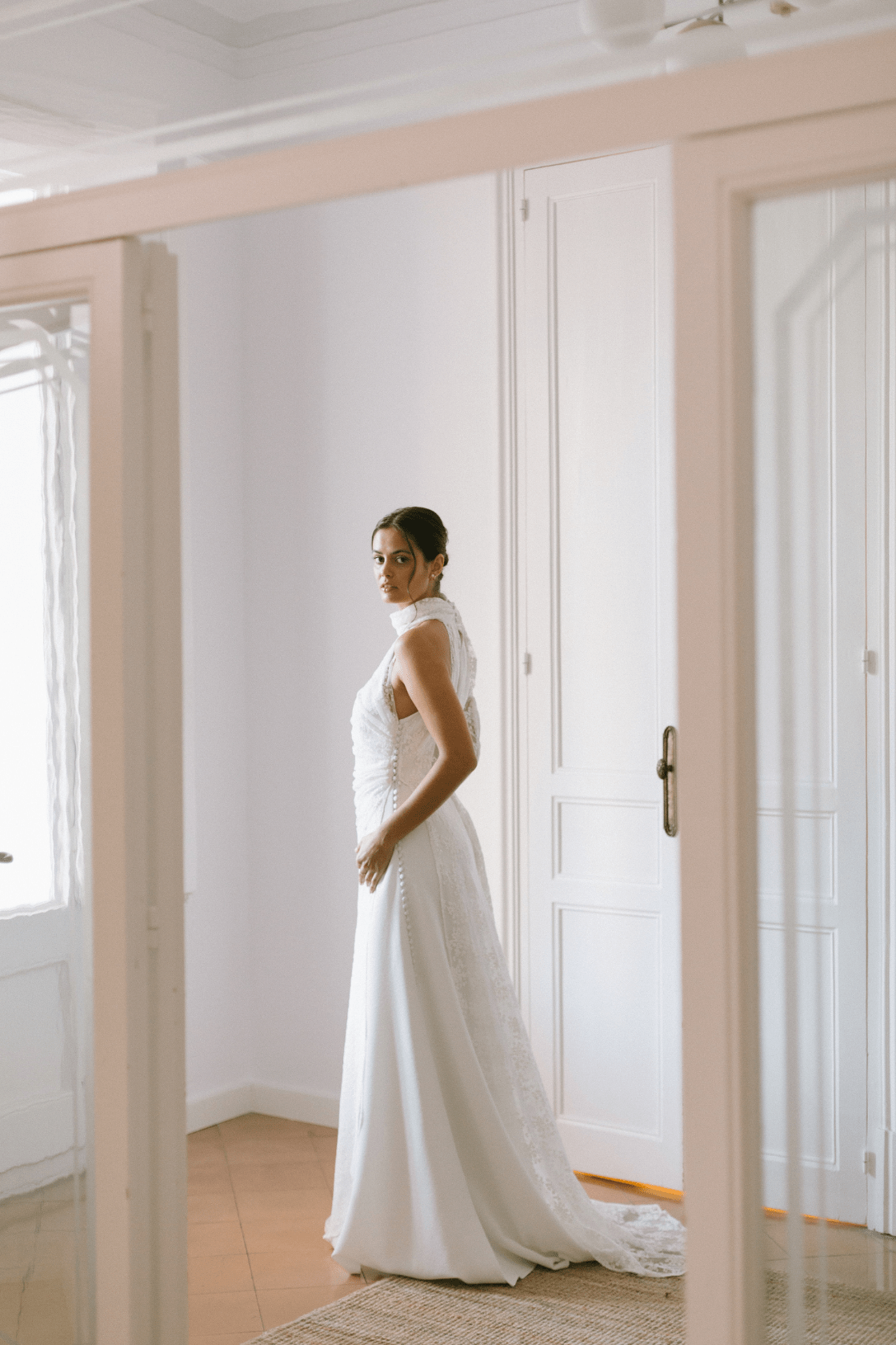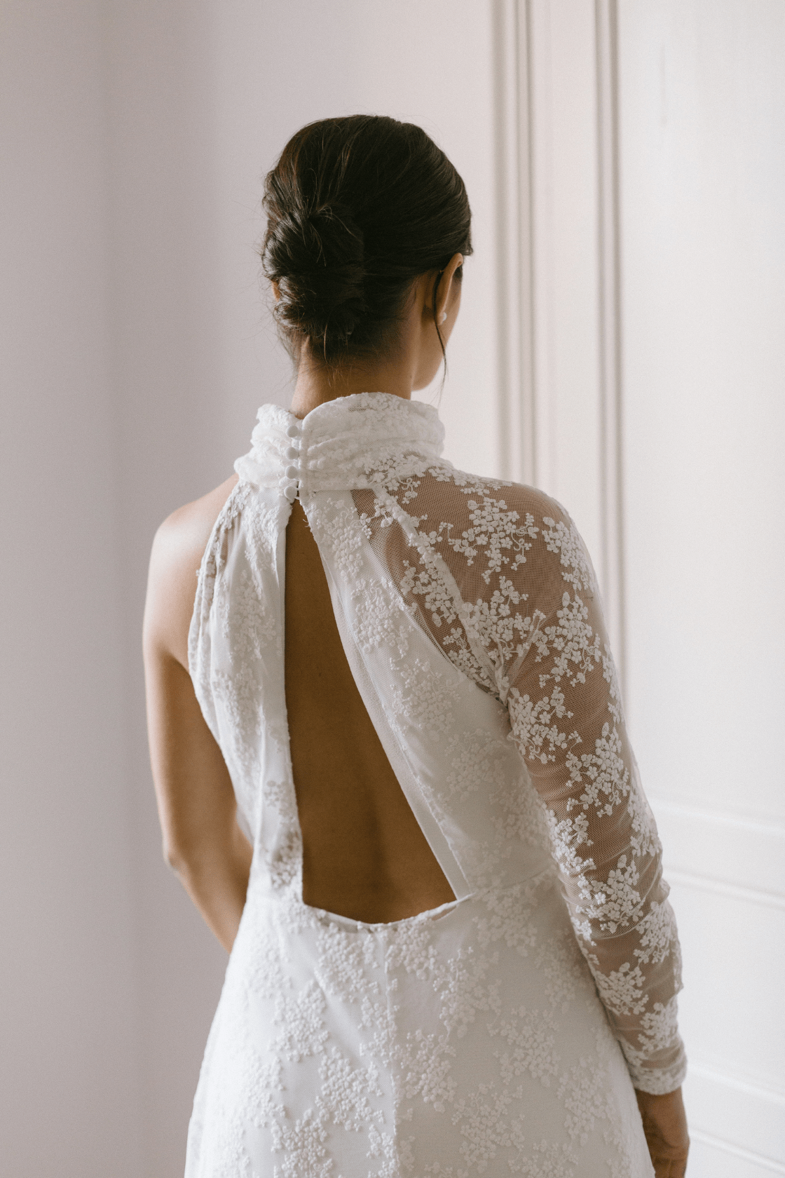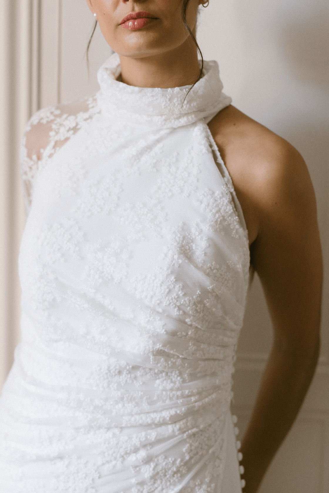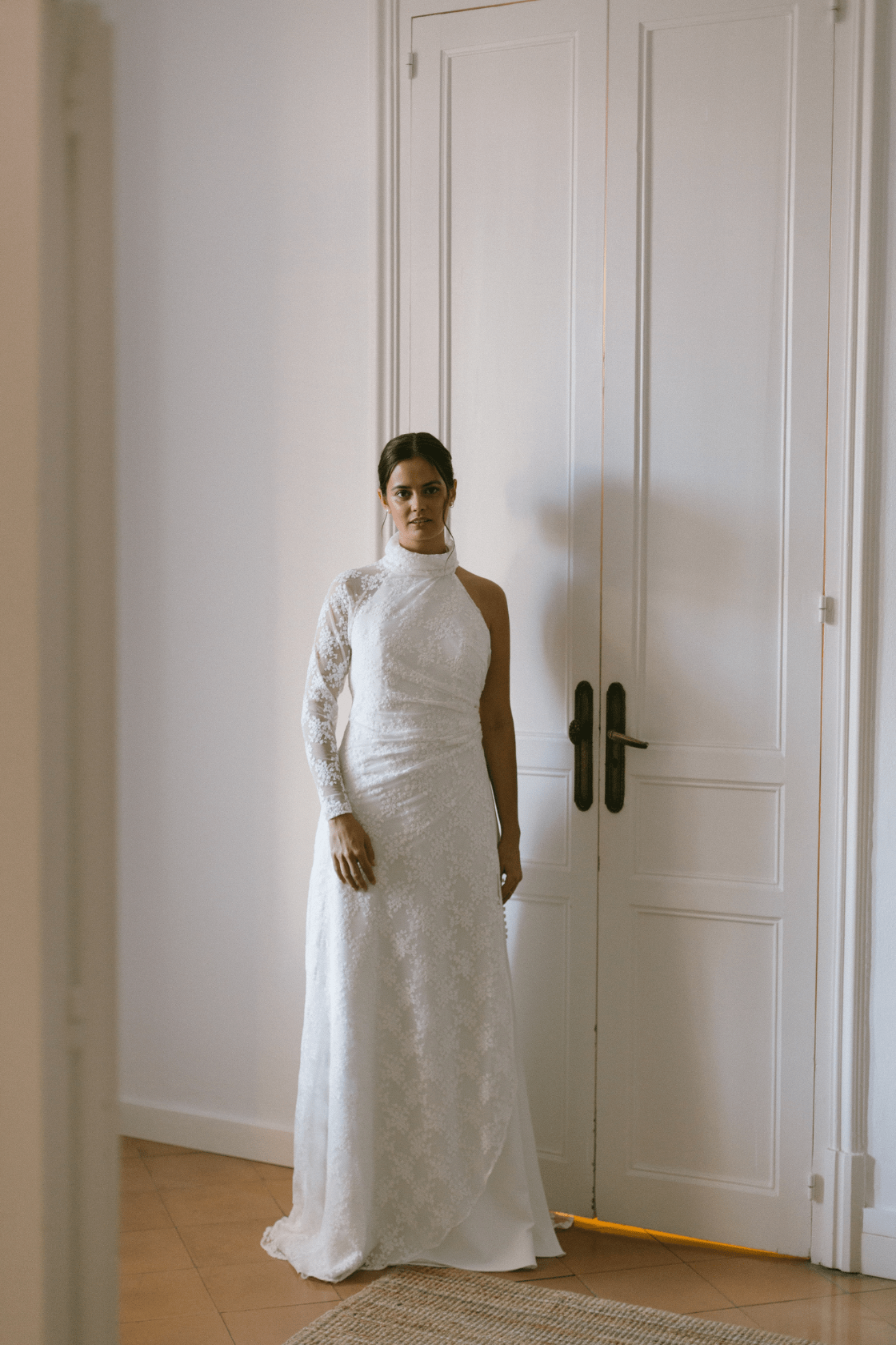 Este vestido de novia combina elegancia minimalista y modernidad. Confeccionado totalmente en crepe forrado, presenta un escote halter que realza los hombros y la silueta. La abertura lateral aporta un toque sensual y permite que se vean los zapatos, mientras que la espalda en forma de lágrima añade delicadeza y sofisticación al conjunto.