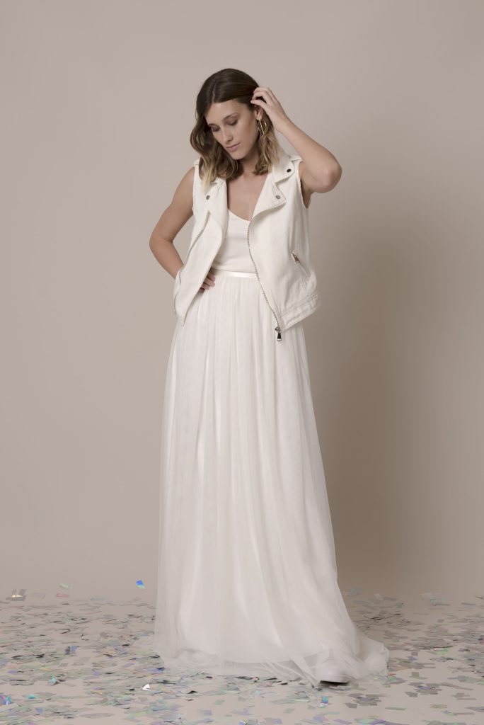 Chaleco Alex + Falda Izta Chaleco de Denim con botones y cremallera metálica, aplicaciones de perlas en la espalda. Falda rizada de tul con cinturilla de satén de seda. Se cierra por detrás con botones forrados.