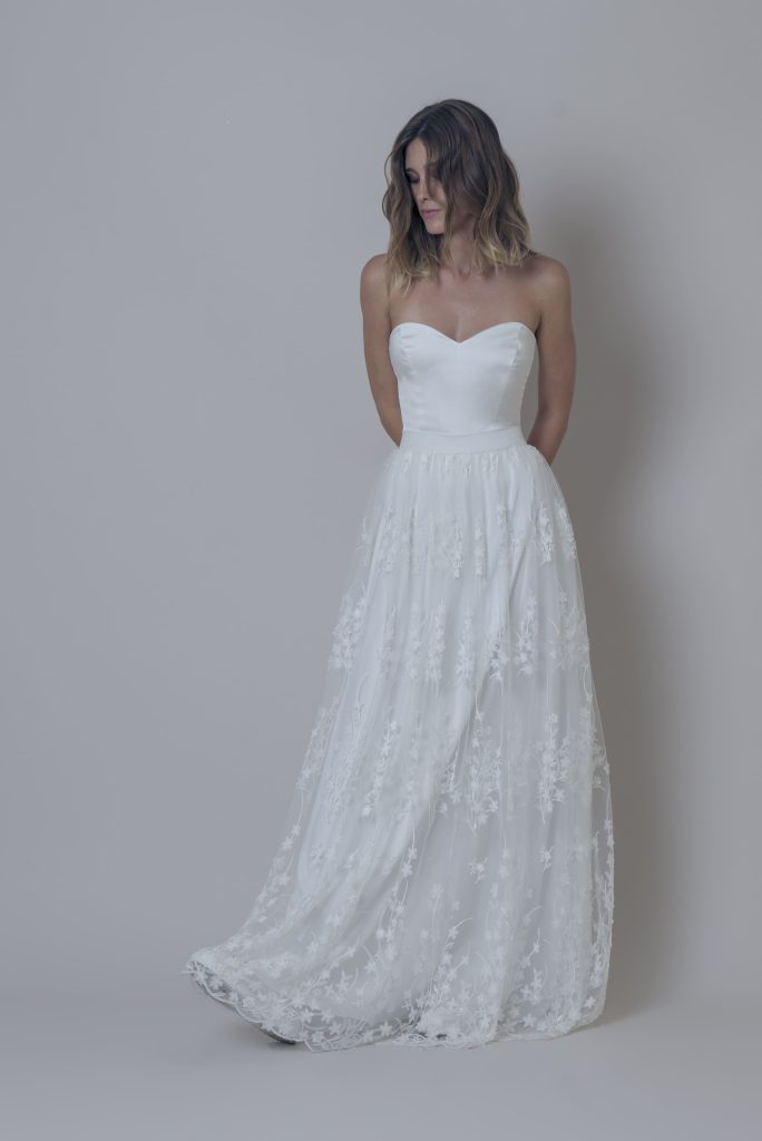 Top TUNA + Falda Catrina Corsé de satén de seda con escote de corazón, cerrado por la espalda con botones de perlas. Falda rizada de tul bordado con aplicaciones de flores en 3D. Se cierra por detrás con 3 botones de perlas en la cinturilla y cremallera invisible.