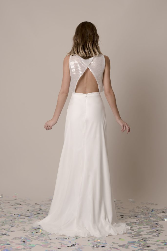 Top Loreto + Falda July Top corto de red de lentejuelas con espalda cruzada en triángulo invertido. Forrado con una capa de tul. Opción de forrar color nude para que no sea transparente. Falda de gasa en evasé cerrada en cinturilla por detrás con botones de perlas y cremallera invisible