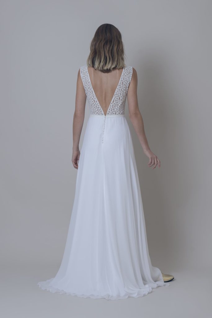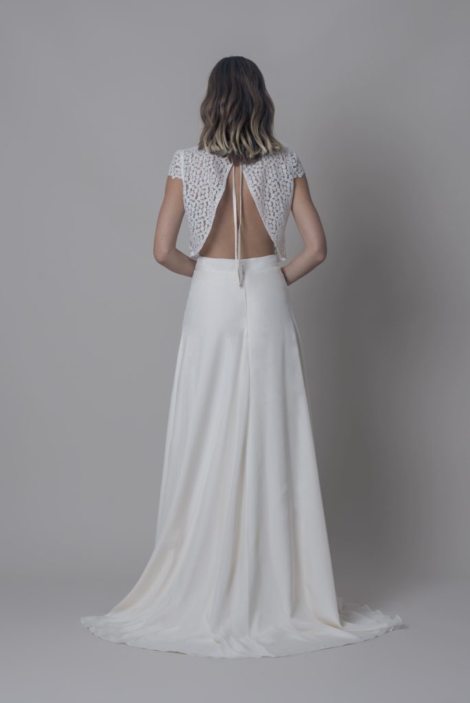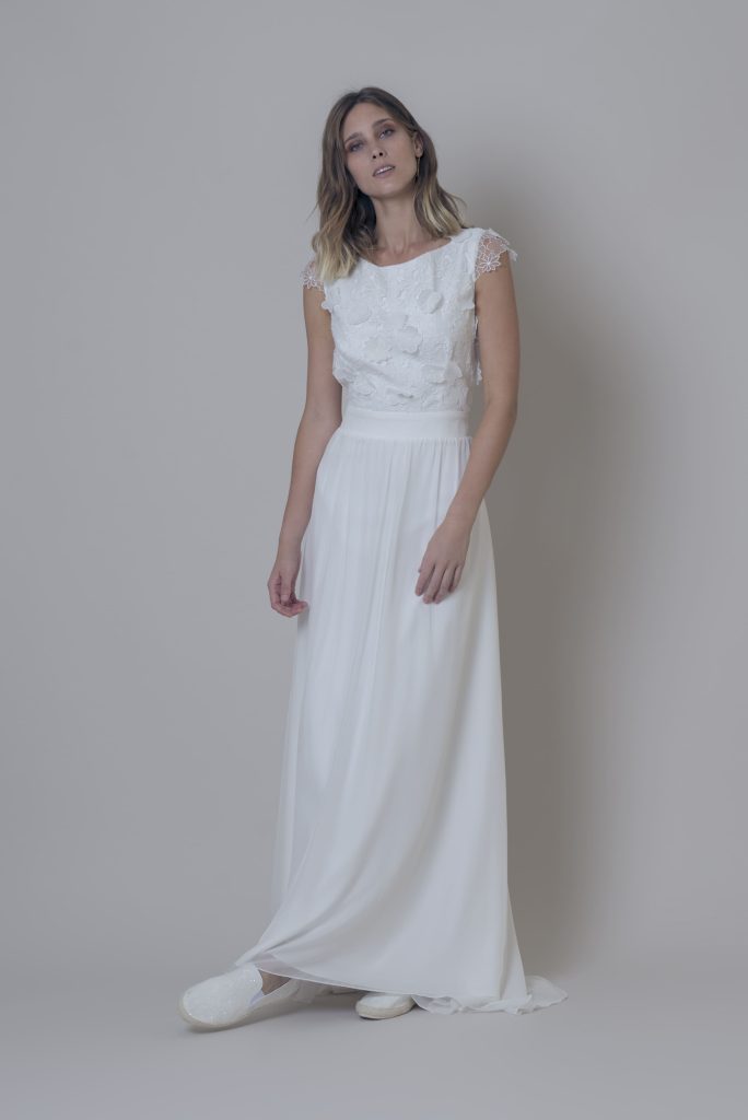 Top Margarita + Falda Karla Top de guipure con espalda abierta en triángulo invertido. Se cierra con un lazo por detrás. Se puede combinar con un top base como el Top Taxco o se puede forrar color nude. Falda de gasa de seda en línea “A” cerrada en cinturilla por detrás con botones forrados y […]