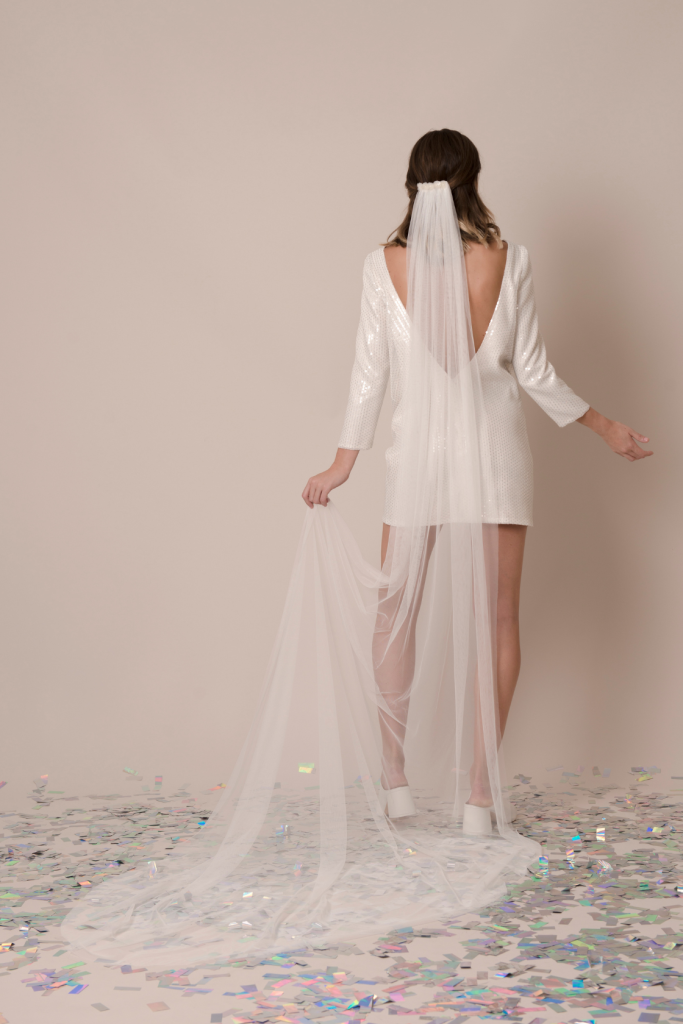 Velo Toh Velo de tul largo con peineta metálica y aplicaciones de flores de lentejuelas.