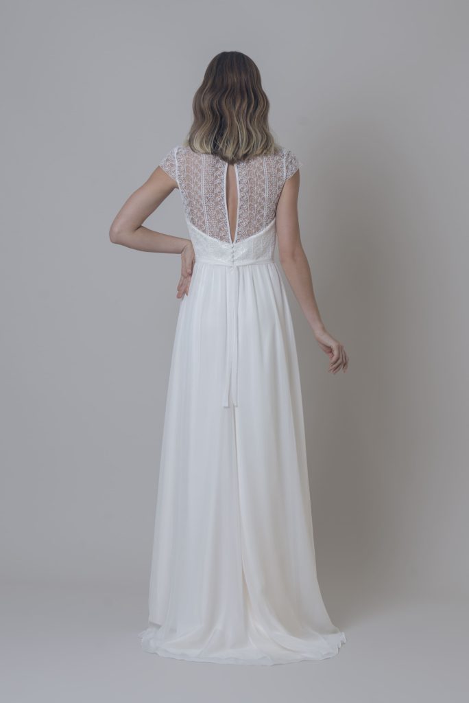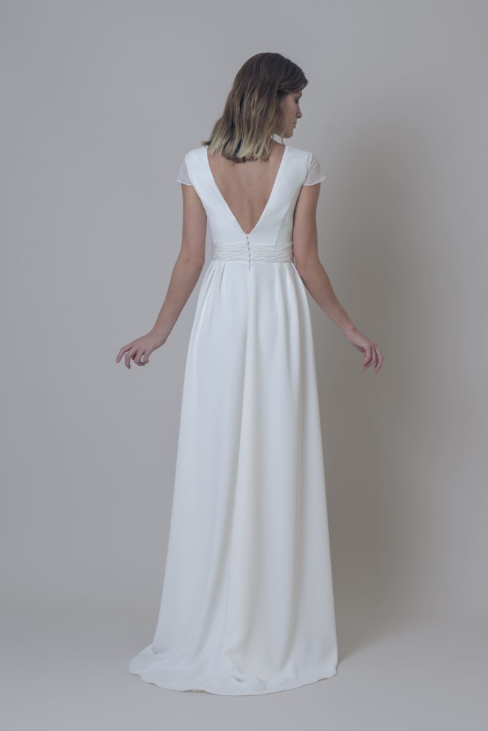 Vestido Lucia Vestido largo con escote de pico por delante y por detrás. Manguita de gasa de seda y cinturón rizado con detalle de botones de perlas por delante y por detrás. Falda de tablas cerrada con cremallera invisible por detrás.