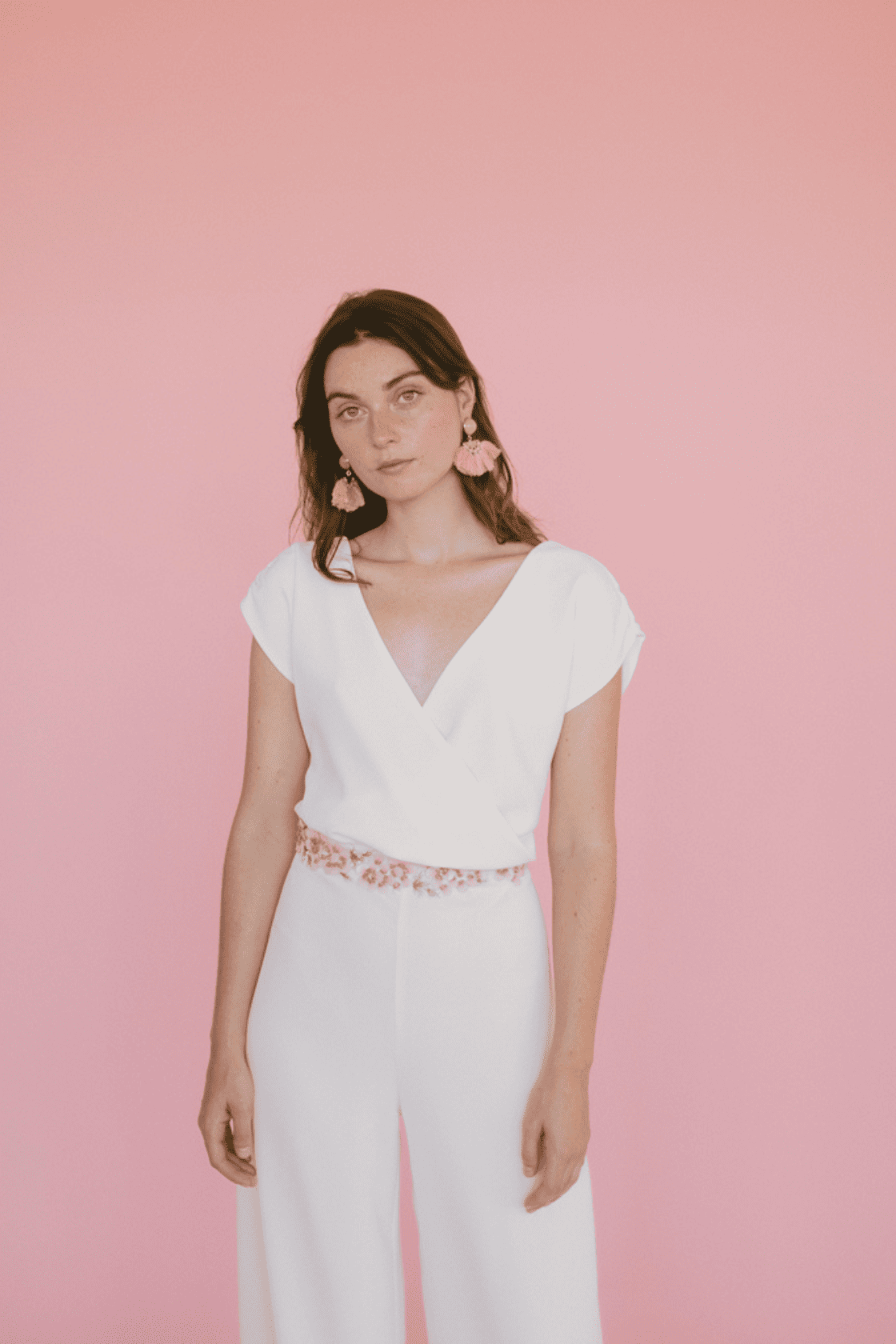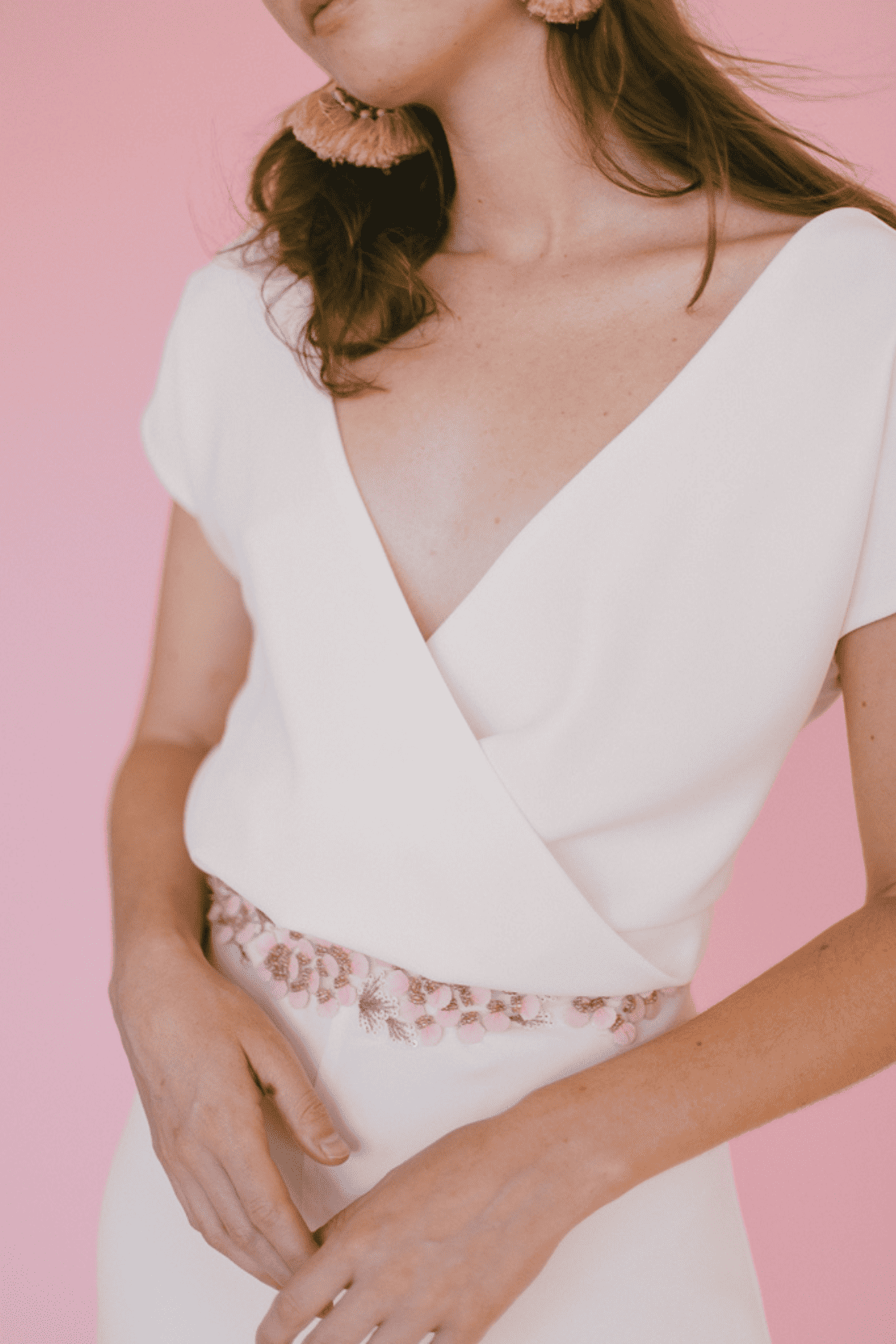Mono de novia elaborado de crepe. Cuerpo cruzado por delante y por detrás con manga tipo hombro caído. Detalle de cinturón bordado en 3D con aplicaciones en tonalidades rosa.