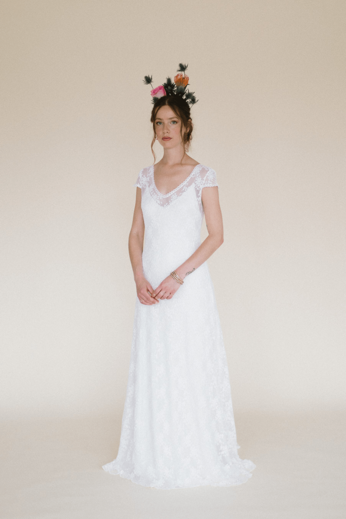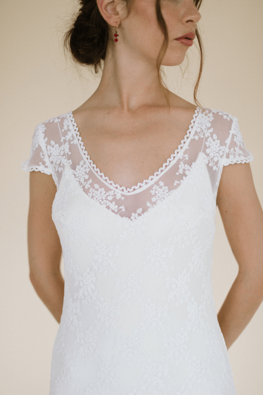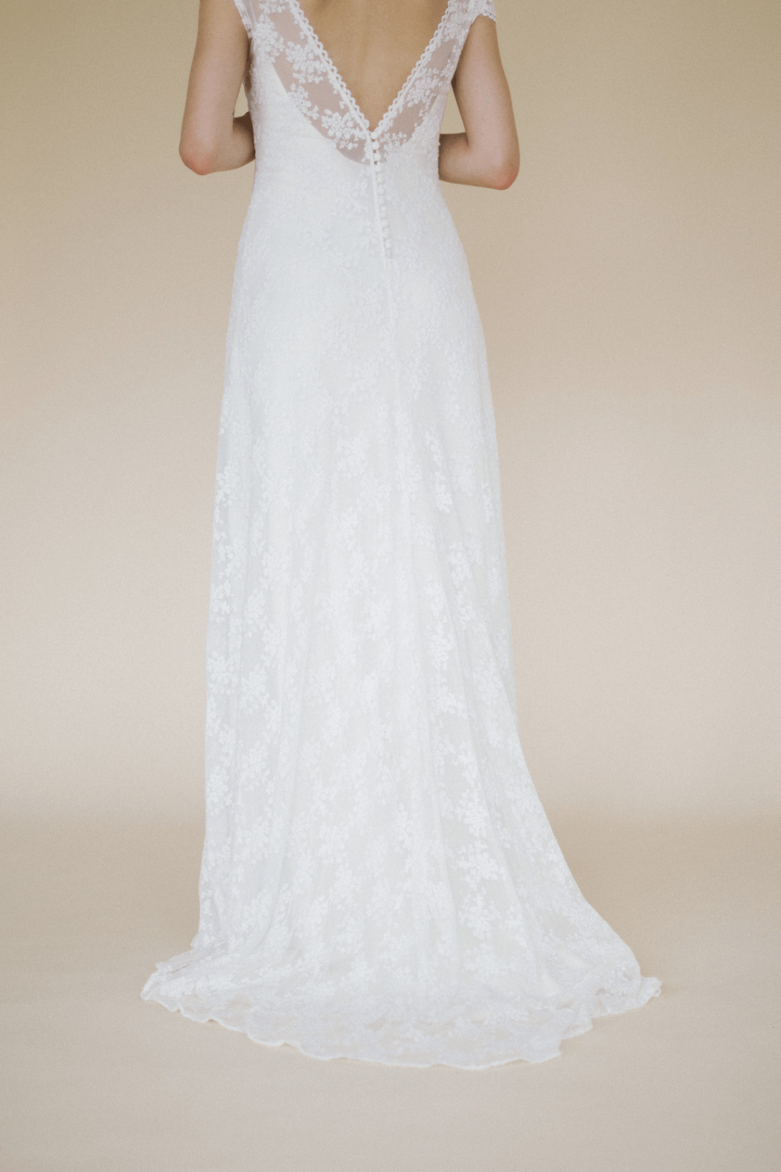 Sobrevestido de novia confeccionado con tul bordado en tonalidades rosas. Manga larga ajustada, cerrada con botones y godet en la parte de la espalda. Se cierra por detrás con botones y presillas.