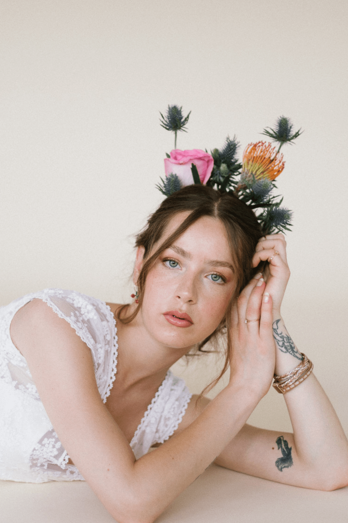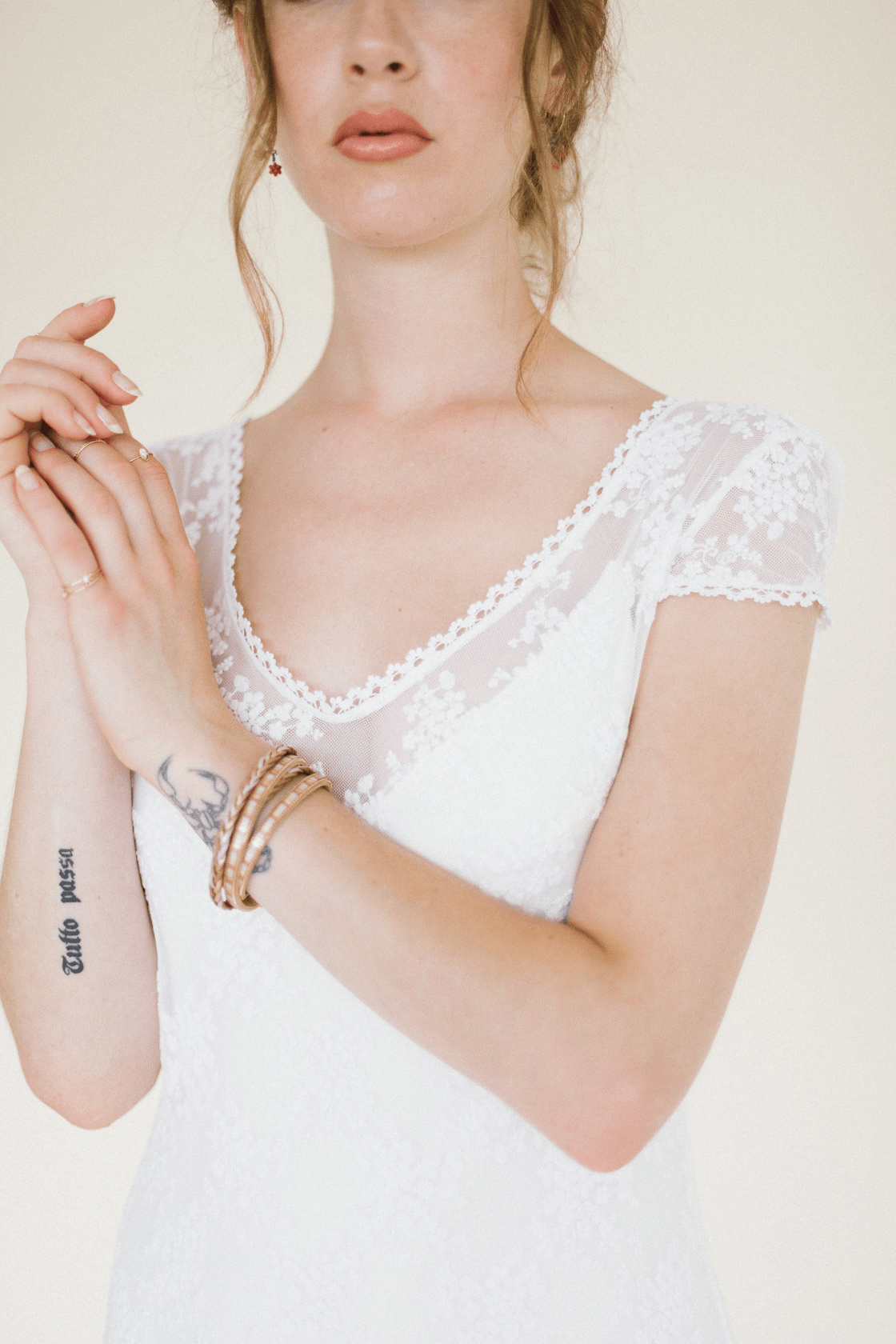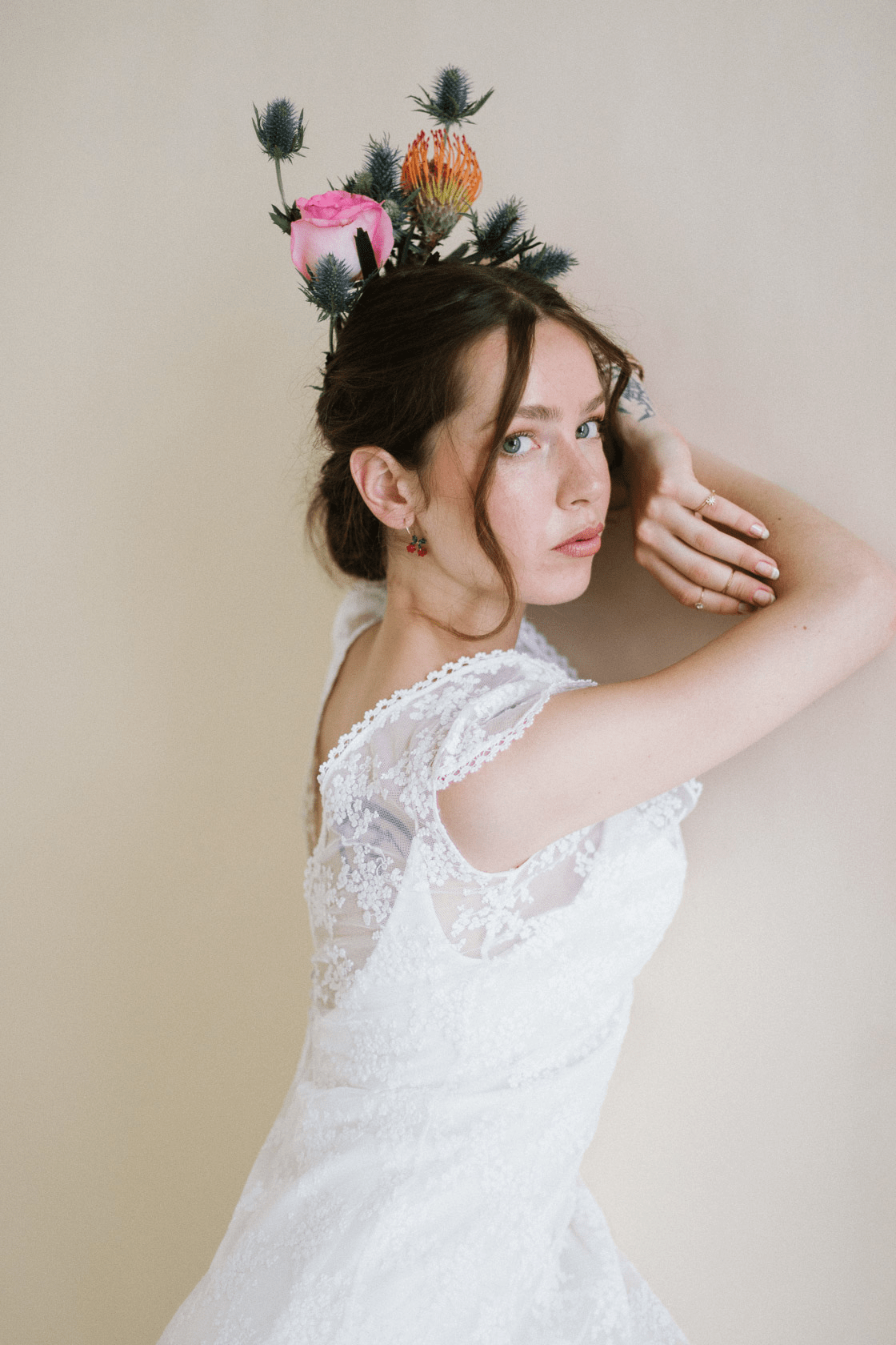 Sobrevestido de novia confeccionado con tul bordado en tonalidades rosas. Manga larga ajustada, cerrada con botones y godet en la parte de la espalda. Se cierra por detrás con botones y presillas.