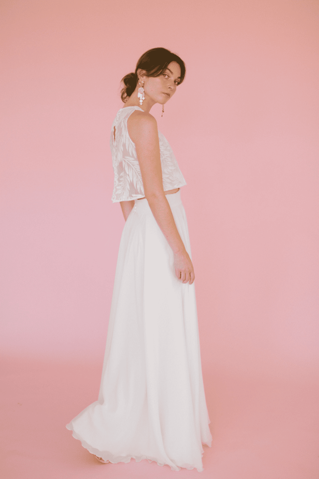Falda de novia de capa circular elaborada con gasa de seda. Cerrada en espalda con botones forrados y cremallera invisible.