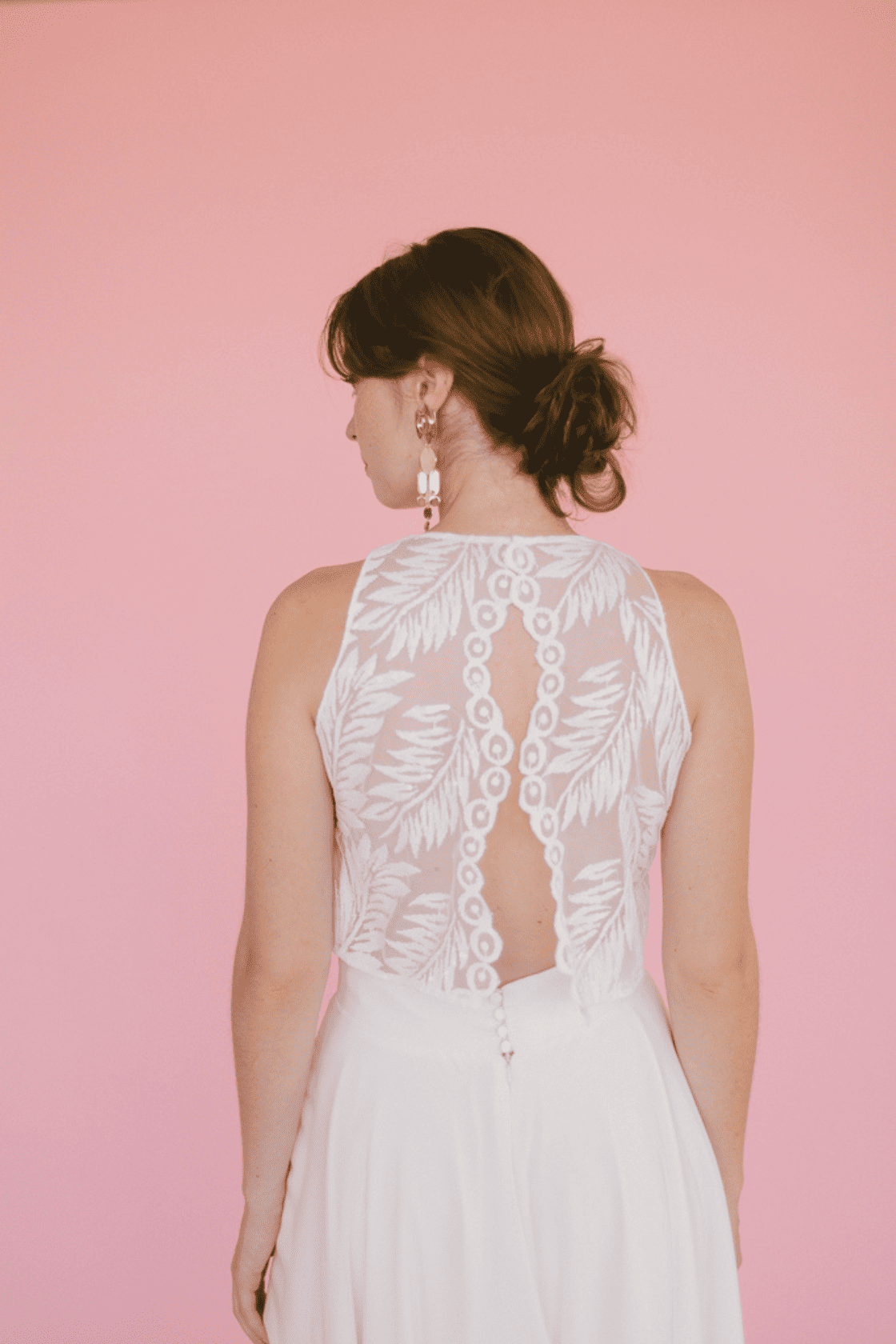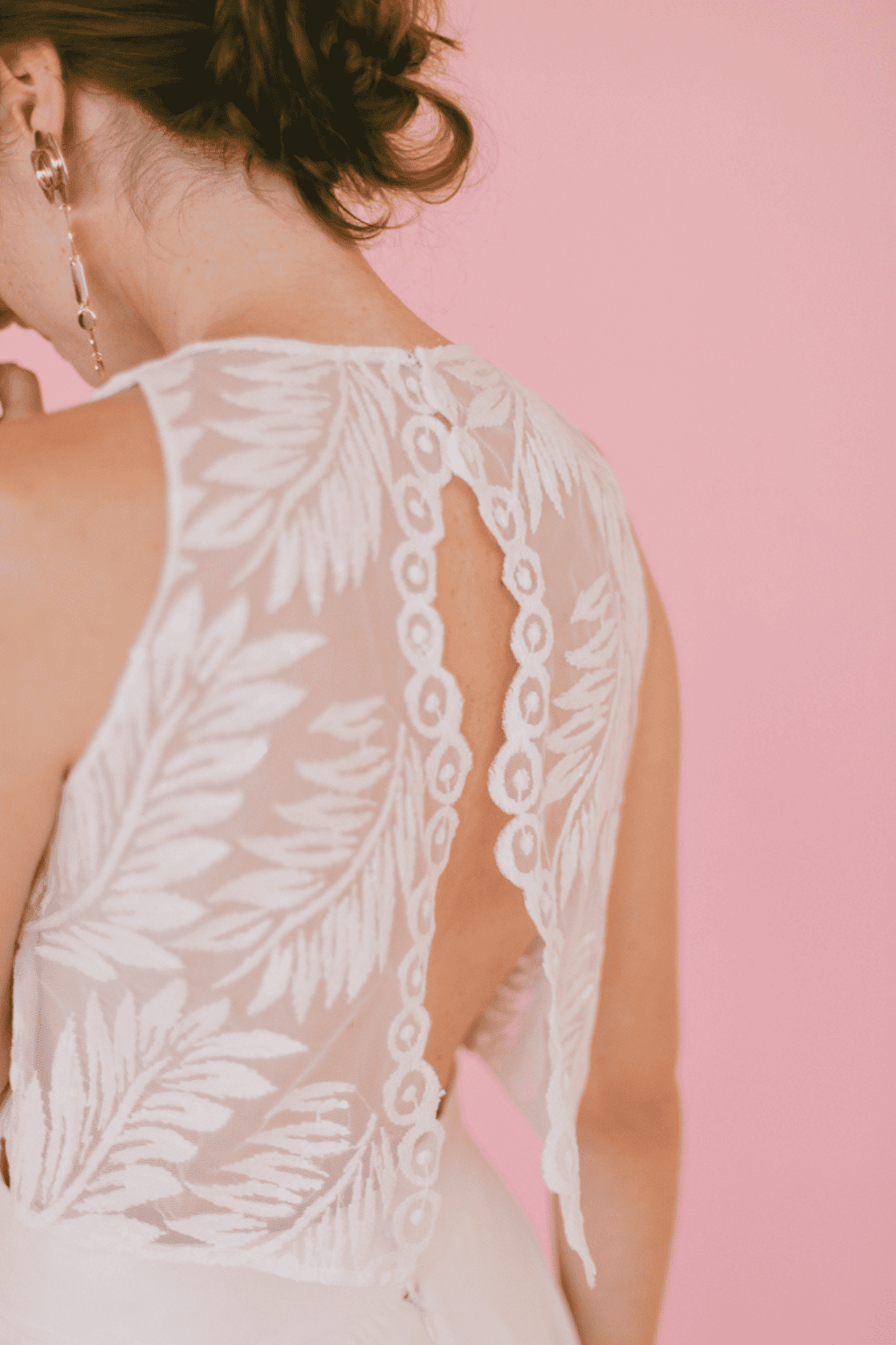 Top de novia con escote halter elaborado con tul bordado con lentejuelas transparentes que dan un efecto sutil de brillo.