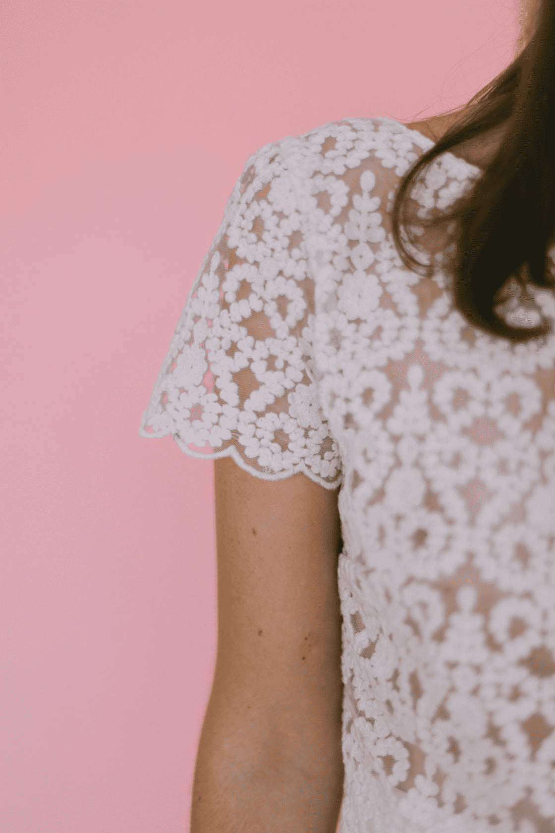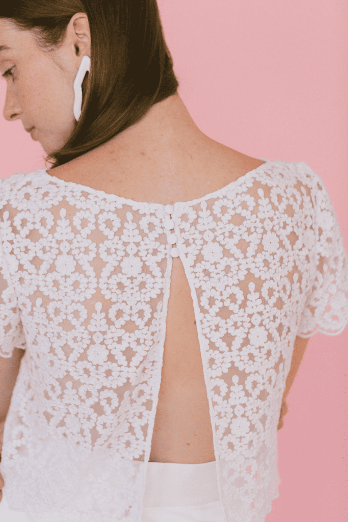 Top de novia con escote en pico por delante y por detrás tirante fino. Elaborado con crepe de seda.