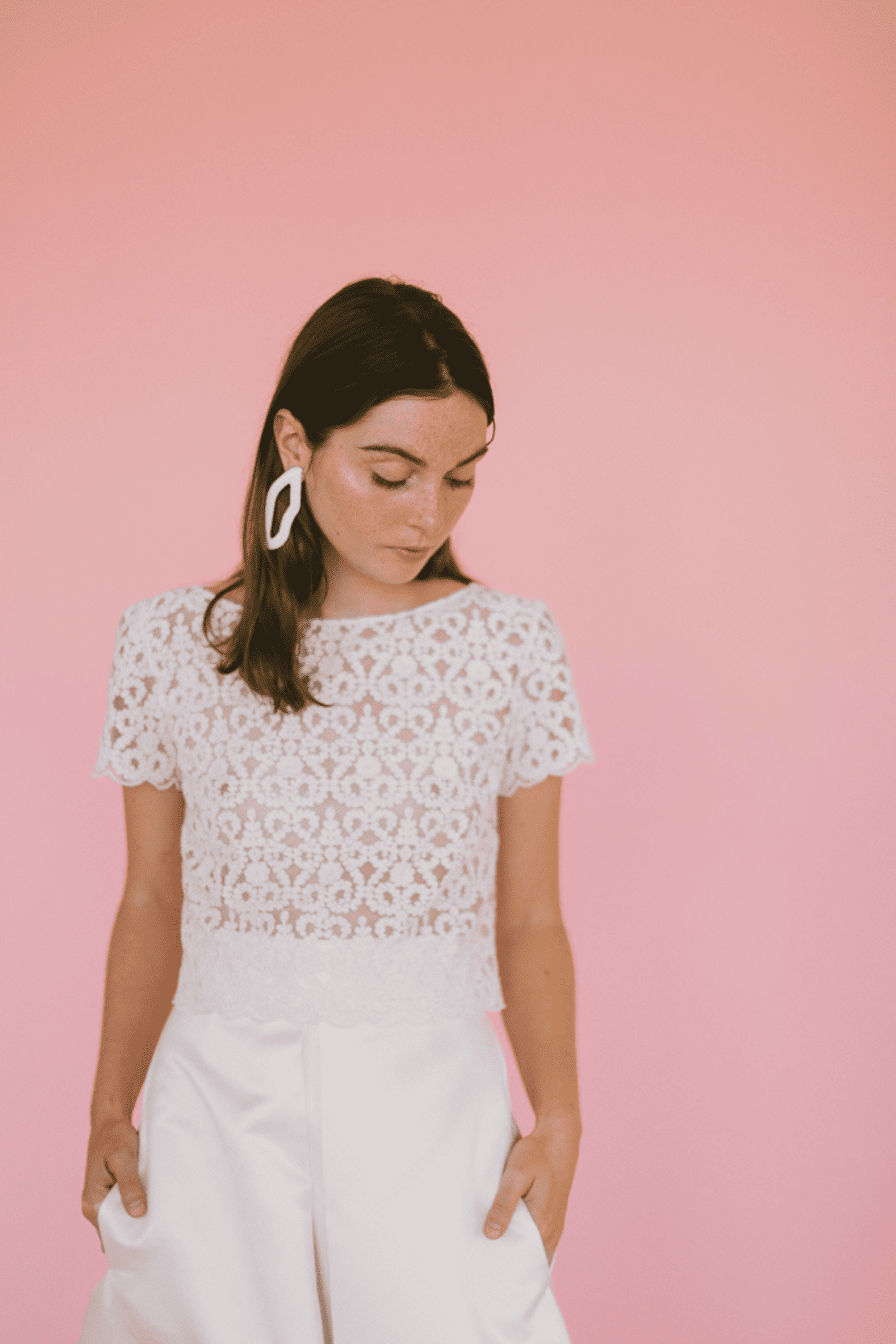 Pantalón de novia ancho elaborado con tul bordado de alfodón. Forro de punto con opción de largo.