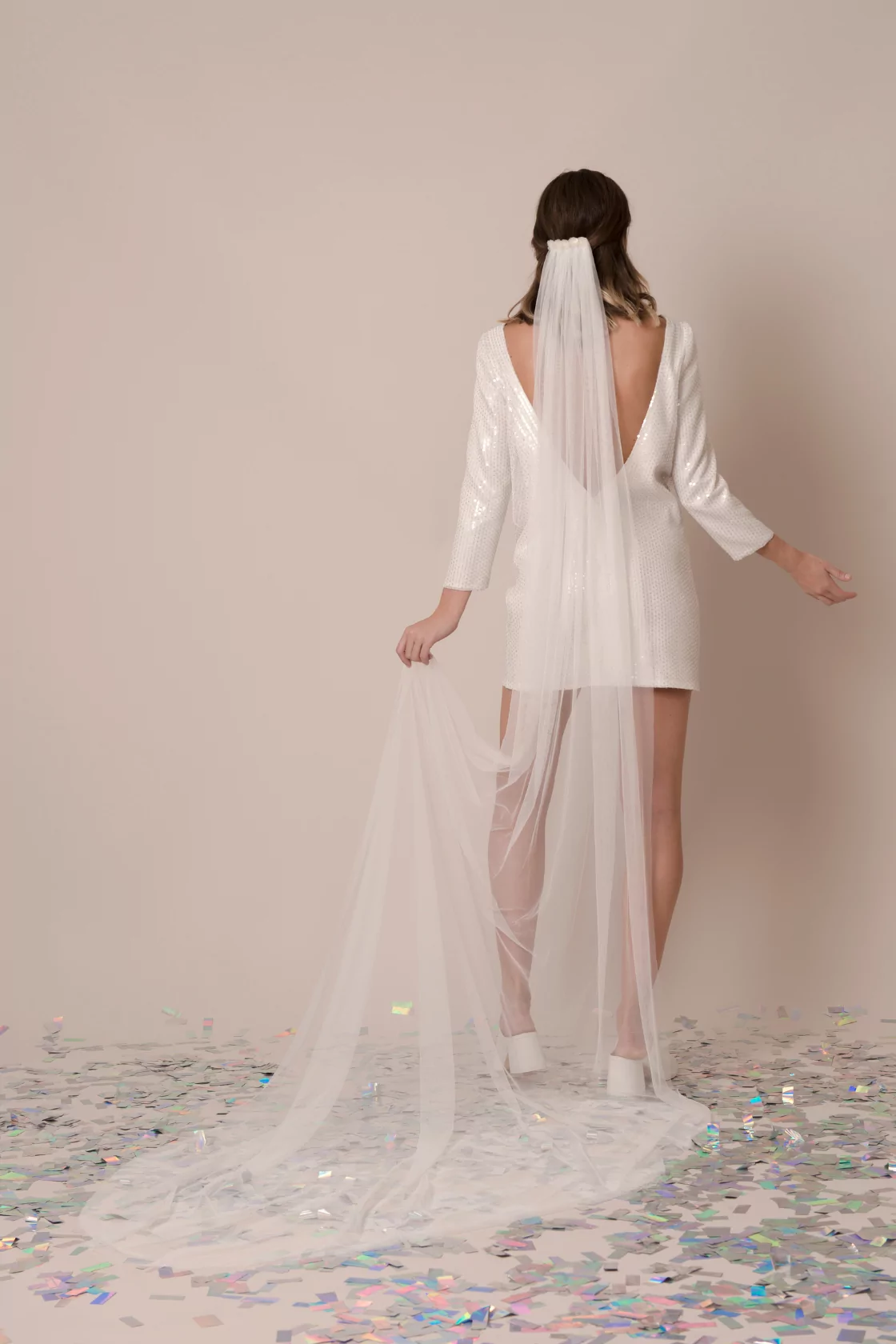 Velo de tul largo con peineta metálica y aplicaciones de flores de lentejuelas.