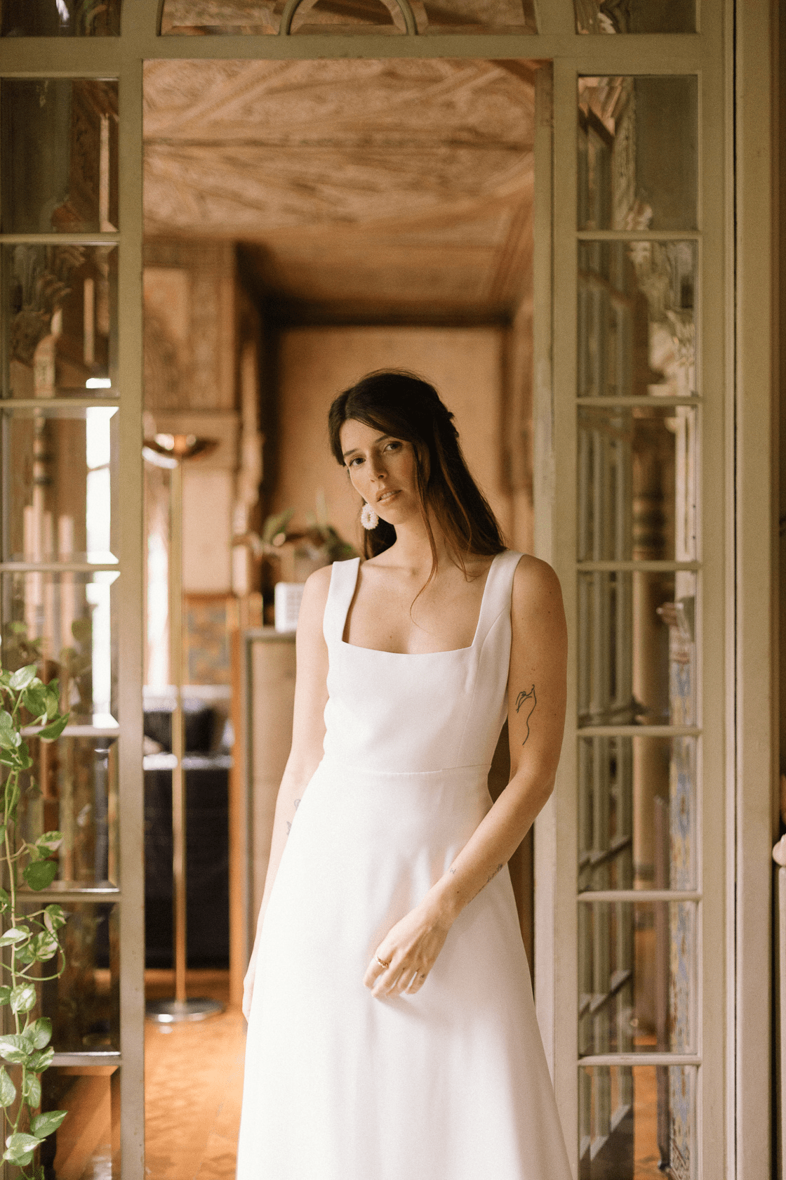 Vestido de novia con escote cuadrado y tirante ancho. Corte a cintura con combinación de tejidos, el cuerpo confeccionado en crepe y la falda en evasé confeccionada en gasa sedosa. Se cierra por la espalda con botones forrados.