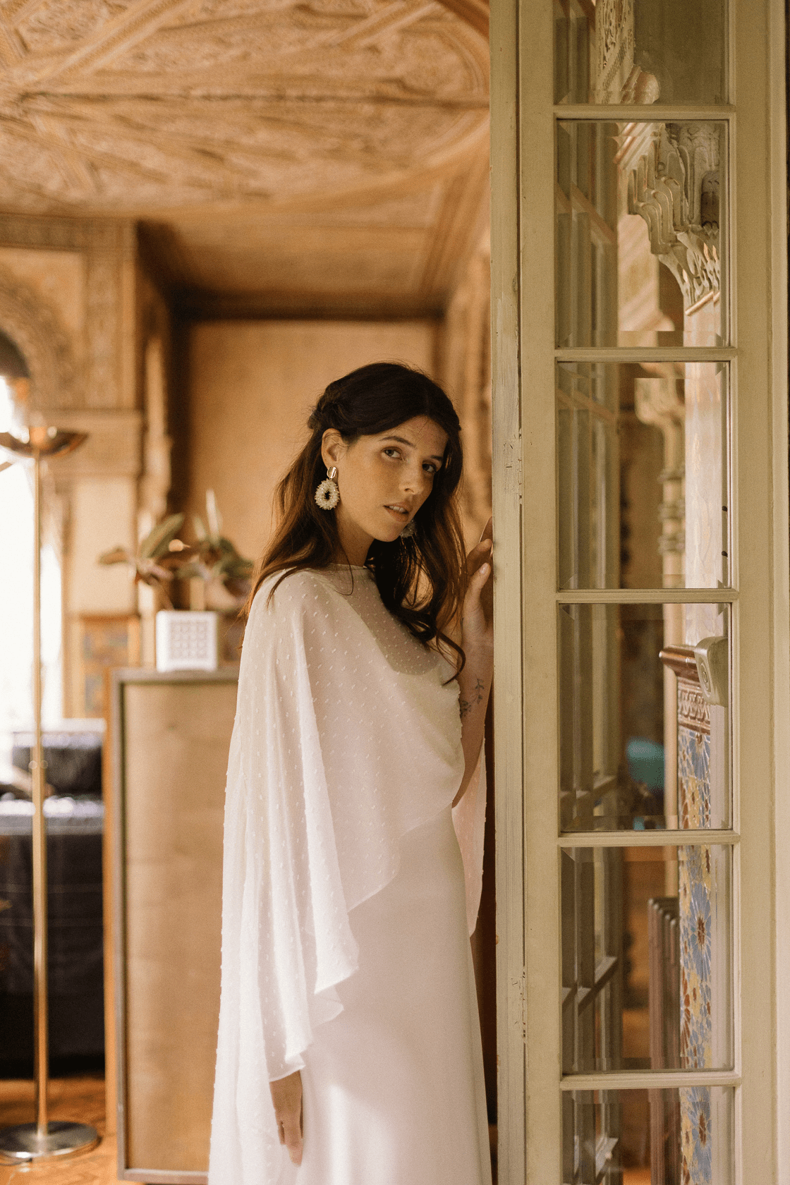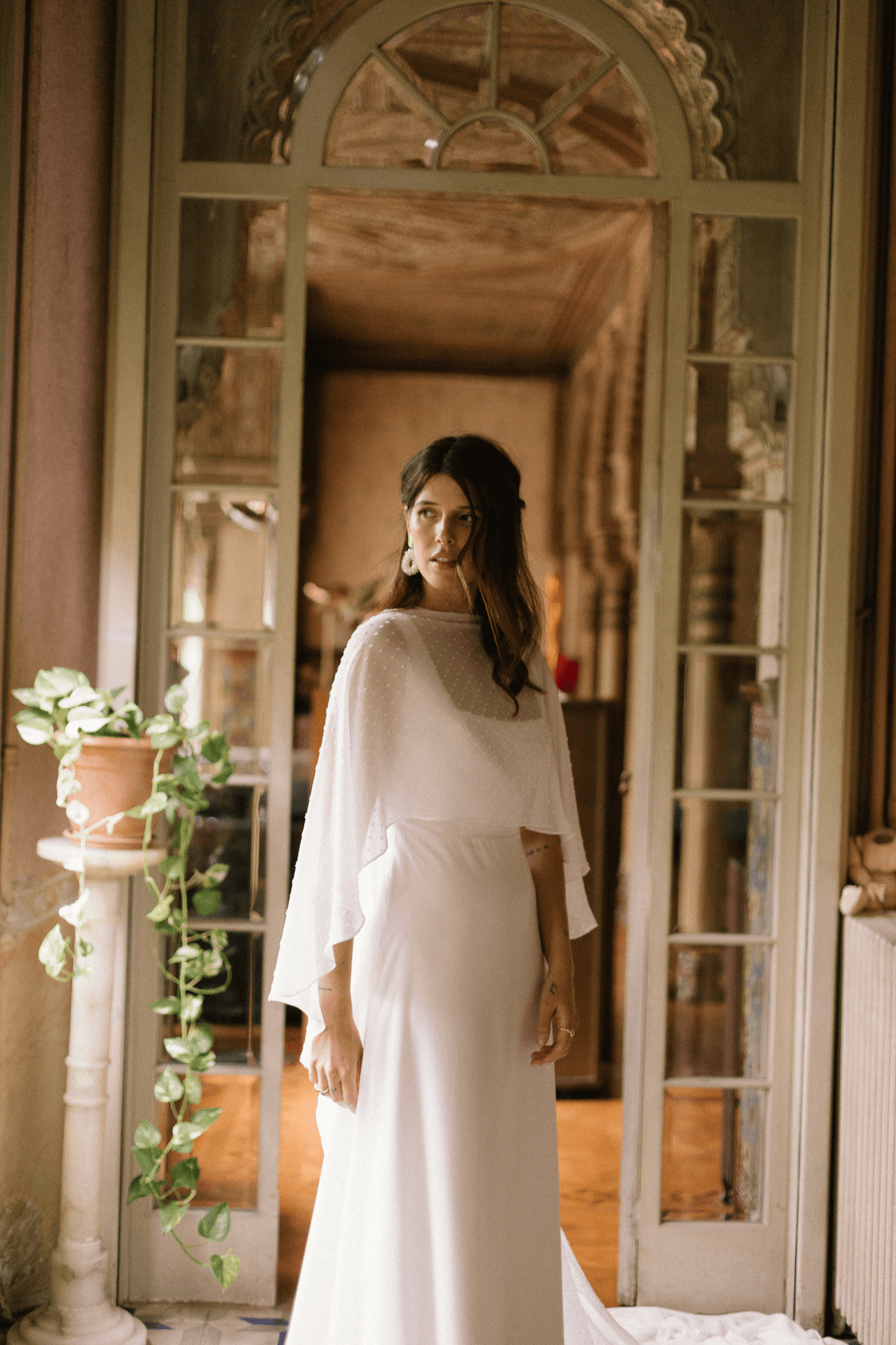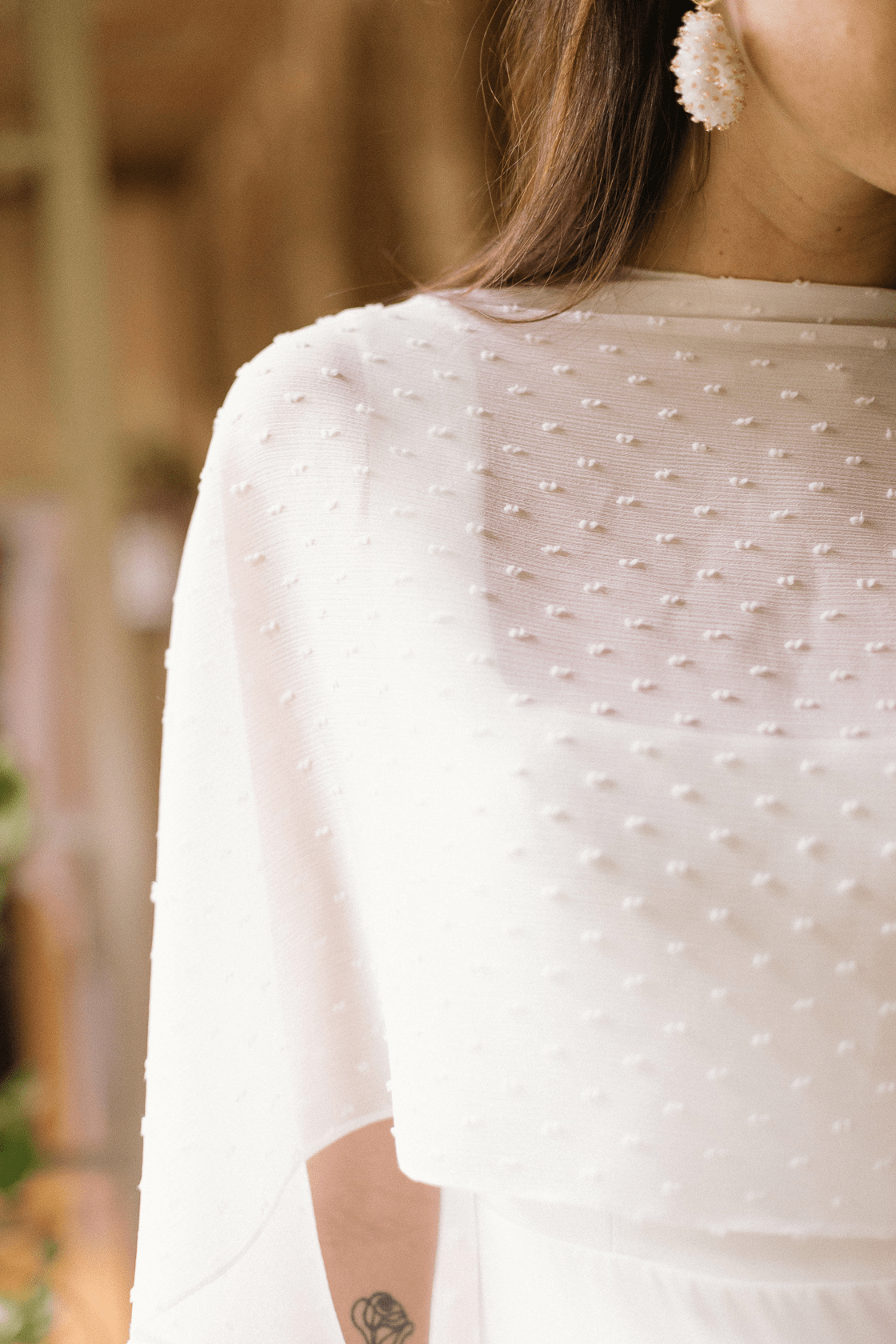 Capa de novia talle a cintura por delante y efecto cauda por detrás.