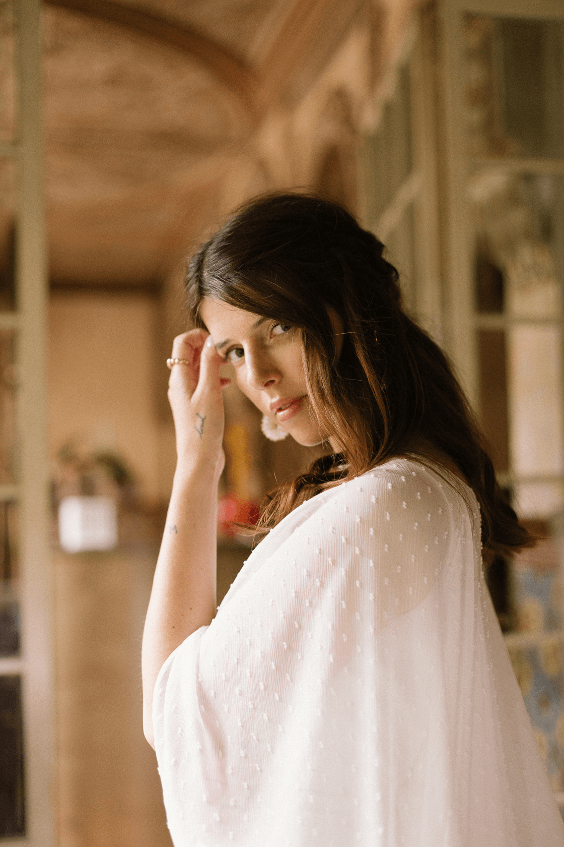 Confeccionada en gasa bambula con sobre bordado plumeti. Se cierra por la espalda con botoncitos forrados