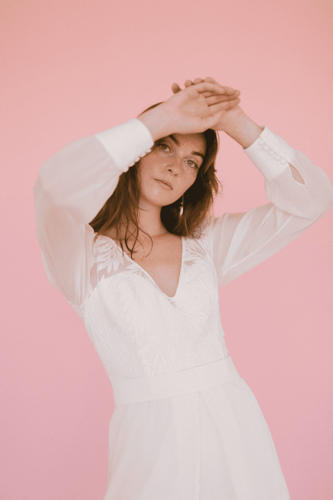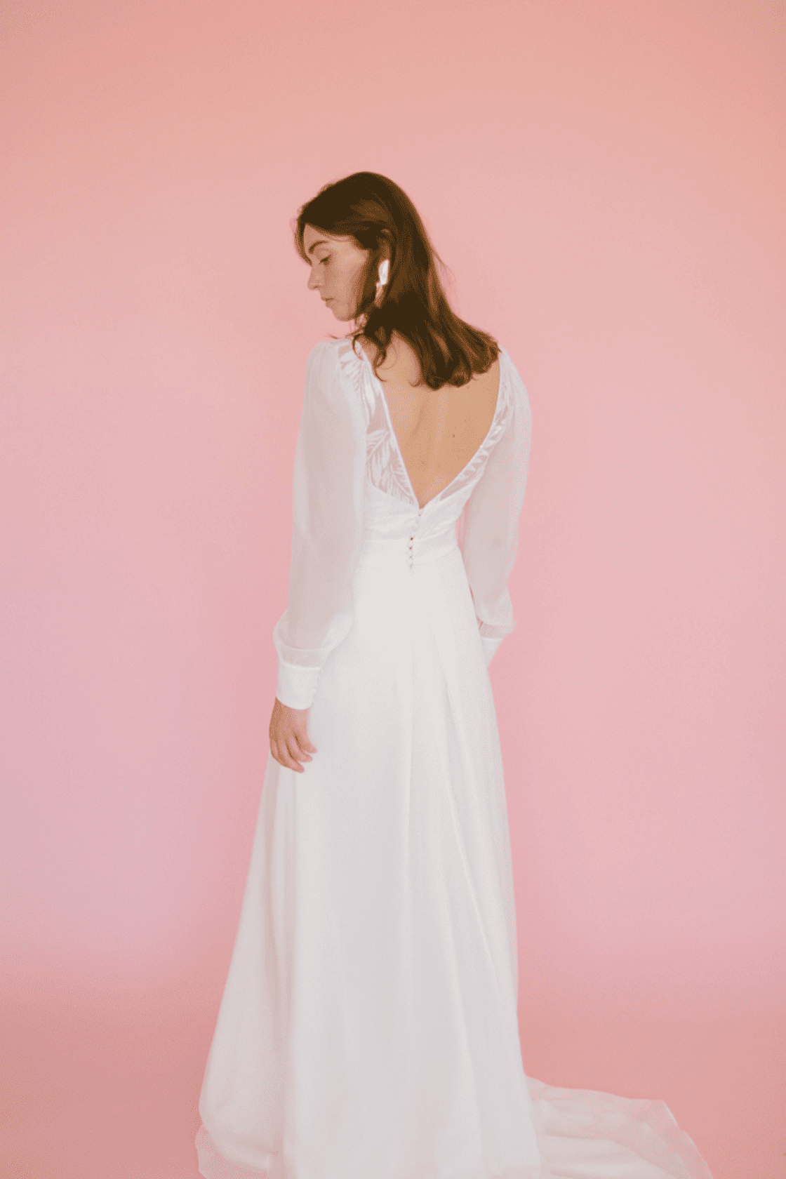 Vestido de novia de gasa de seda. Falda amplia con tablón por delante y por detrás. Cuerpo corsé con escote de corazón y sobrecuerpo con escote ilusión de pico. Manga larga abullonada con puño que cierra con botones forrados.
