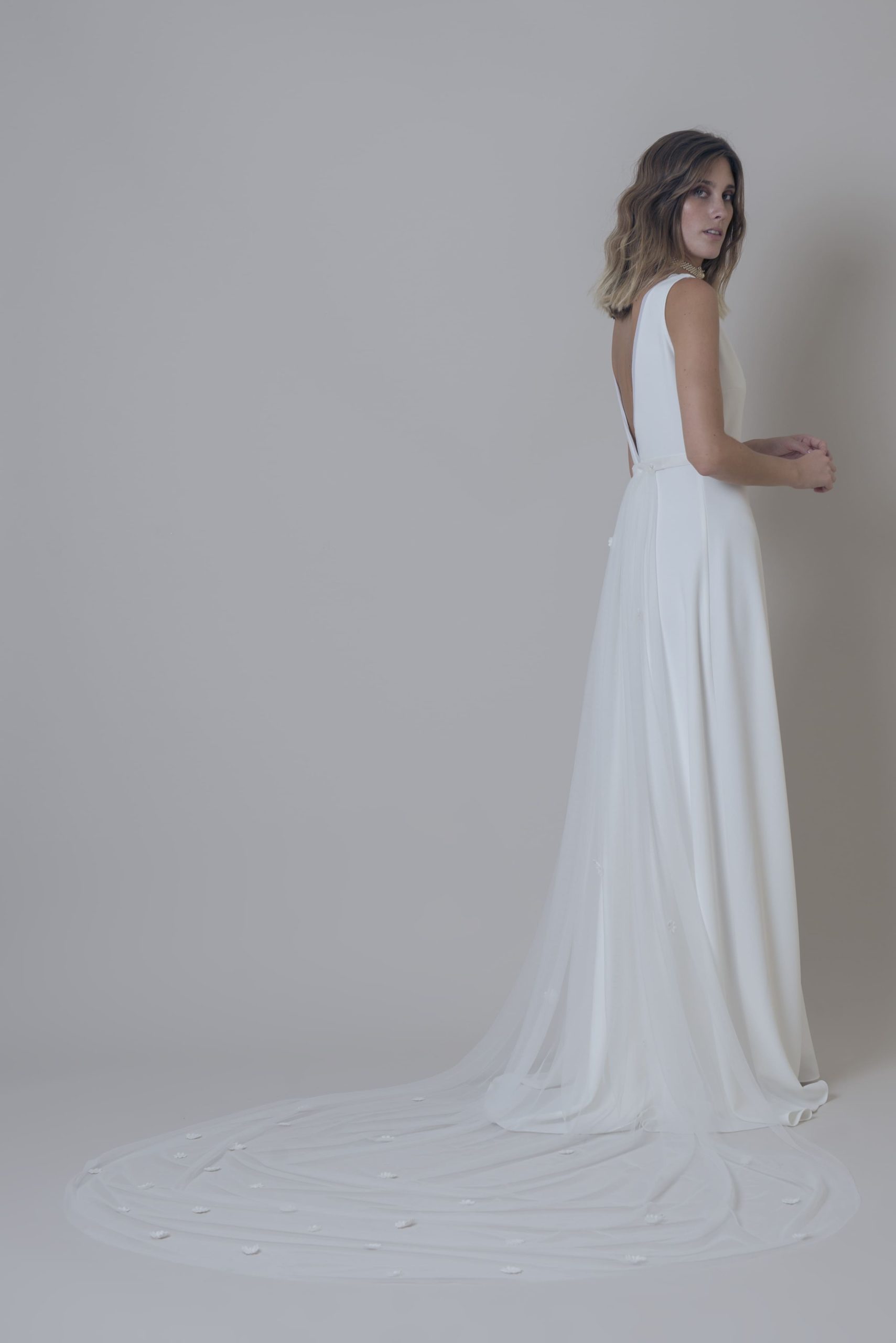Vestido largo con cuerpo cruzado por delante y en pico por detrás. Detalle de bies de gasa en escote y cinturilla. Falda en línea “A” cerrada con botones de perla por detrás. La cola Colibrí se quita y se pone con unos pequeños botones de presión.