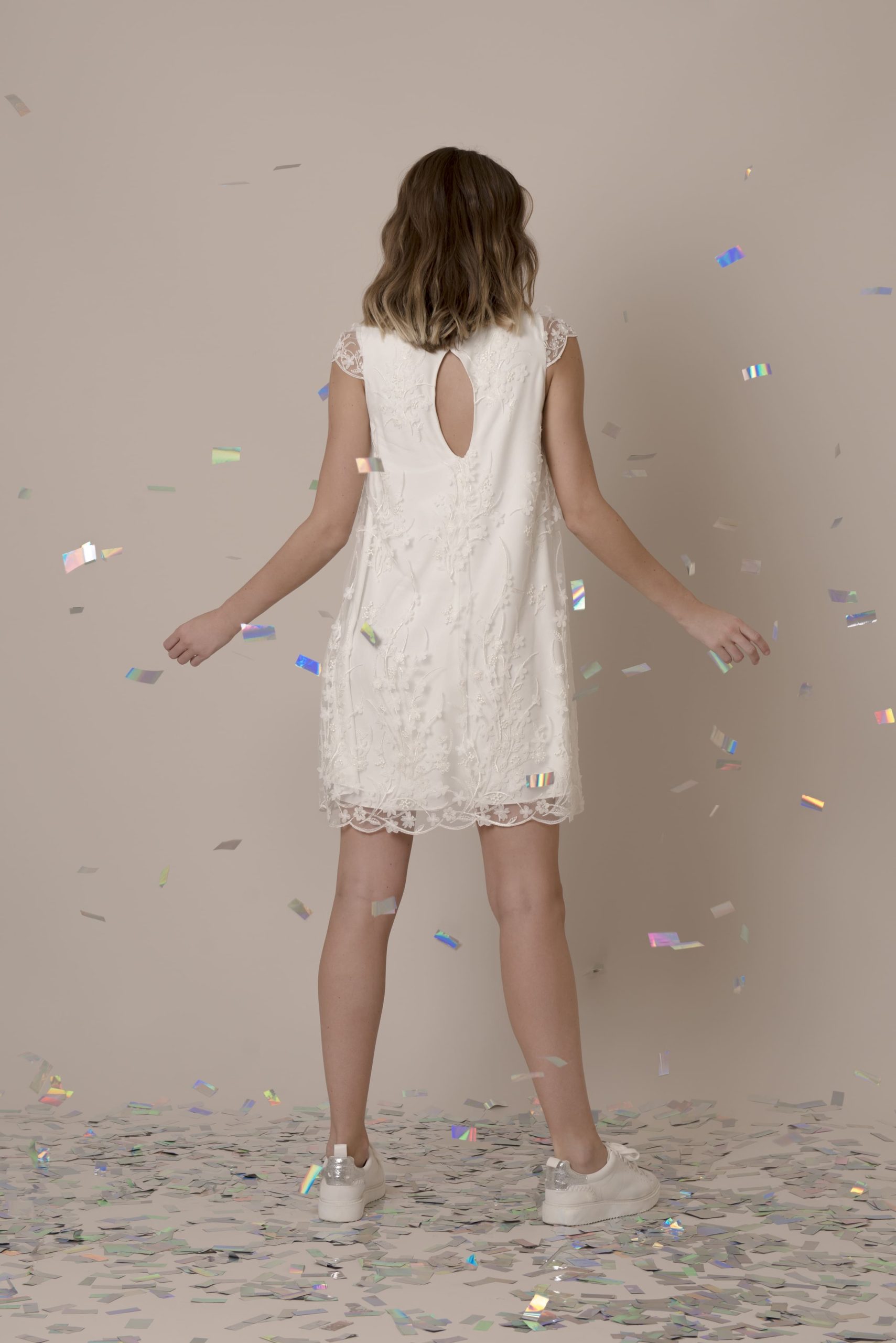 Vestido corto de tul bordado corte línea “A” con manguitas transparentes. El ojal que tiene en la espalda se cierra con dos botones de perla.