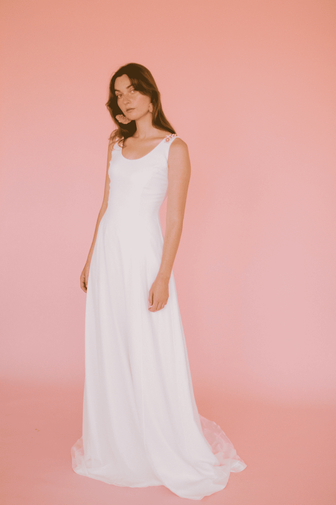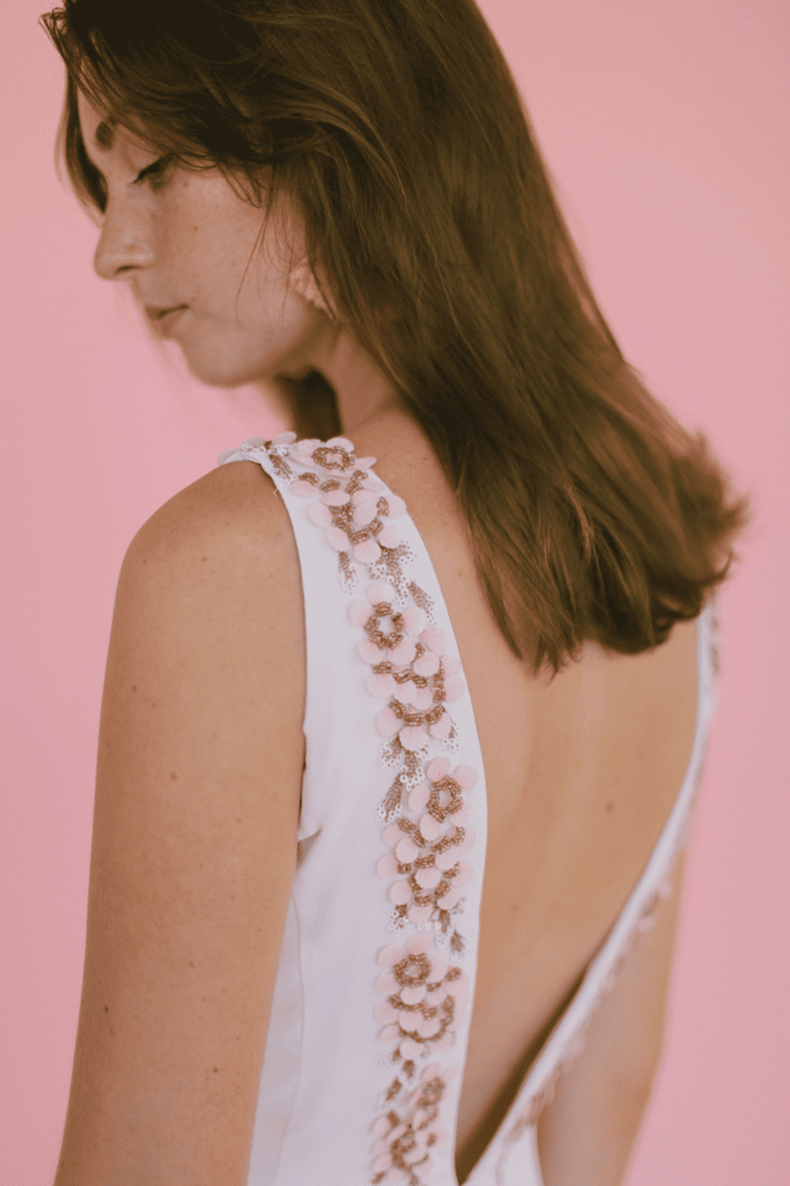 Vestido de novia elaborado de georgette de seda. Escote redondo por delante y escote pico por detrás. Se cierra con botones forrados por la espalda. Detalle bordado en 3D en tonalidades rosa en escote de espalda