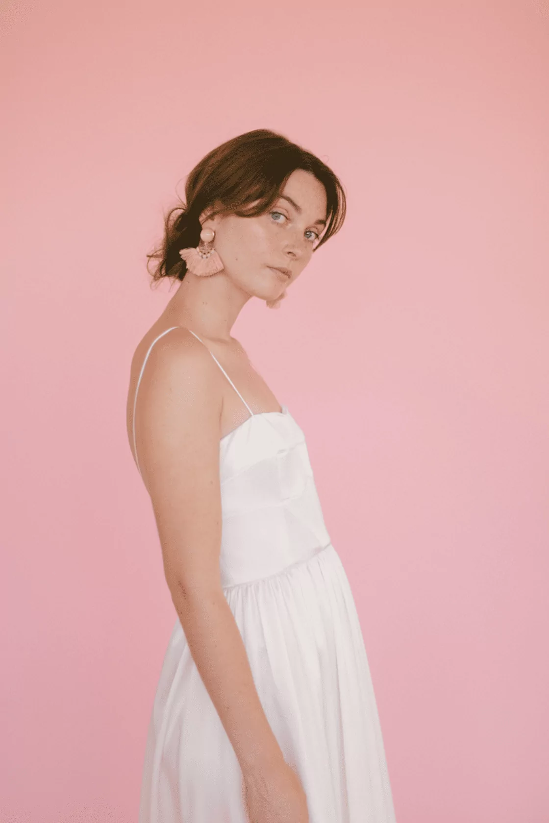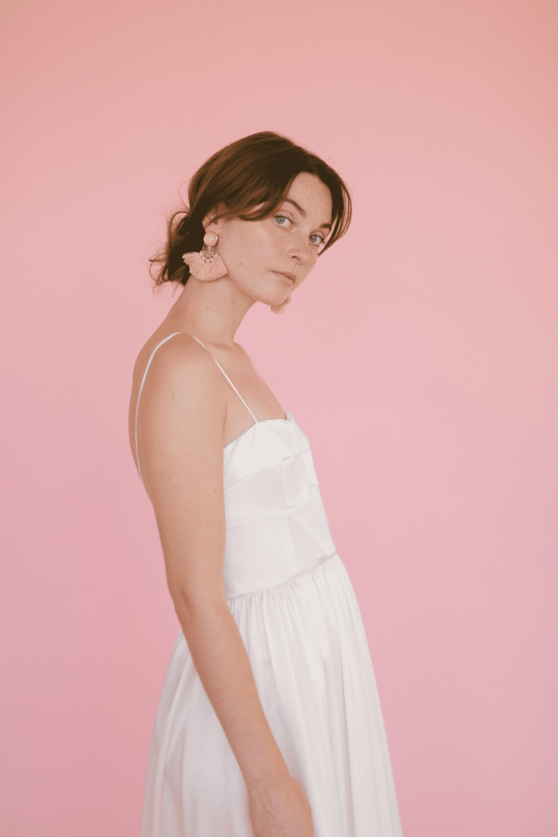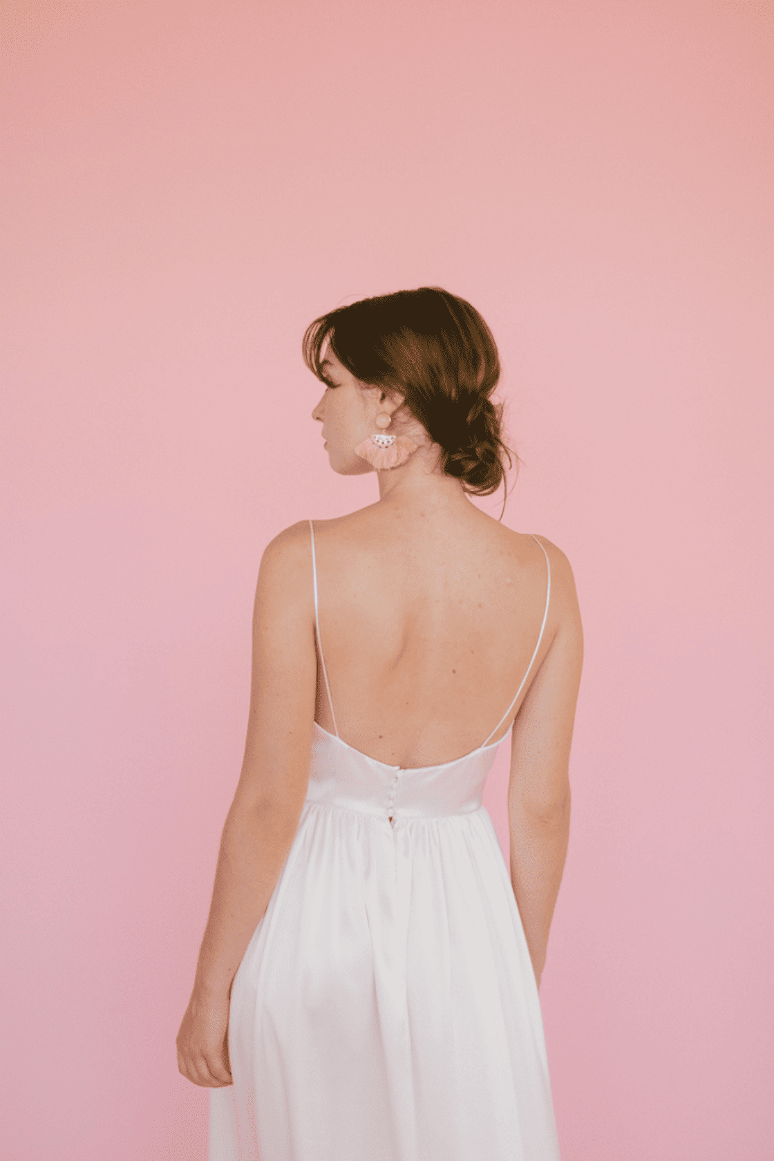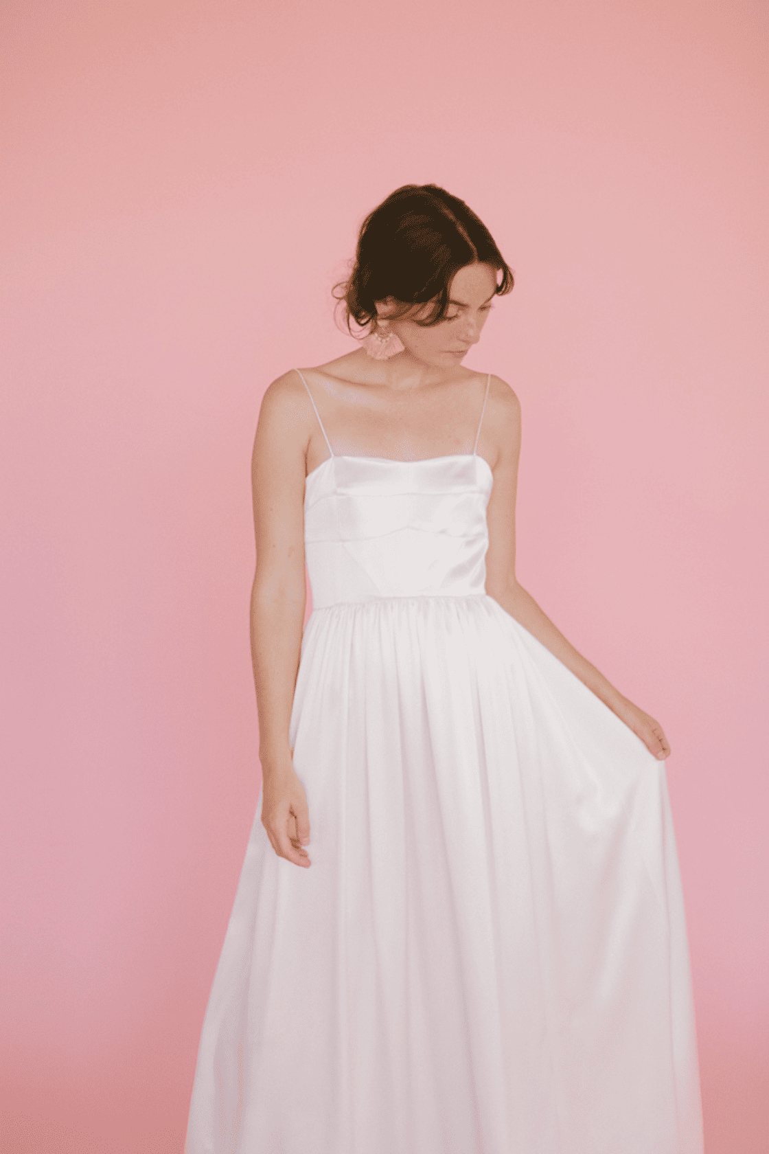 Vestido de novia de crepe satinado de seda. Escote recto con costuras en cuerpo y falda rizada. Tirantes finos y botones forrados en la espalda.